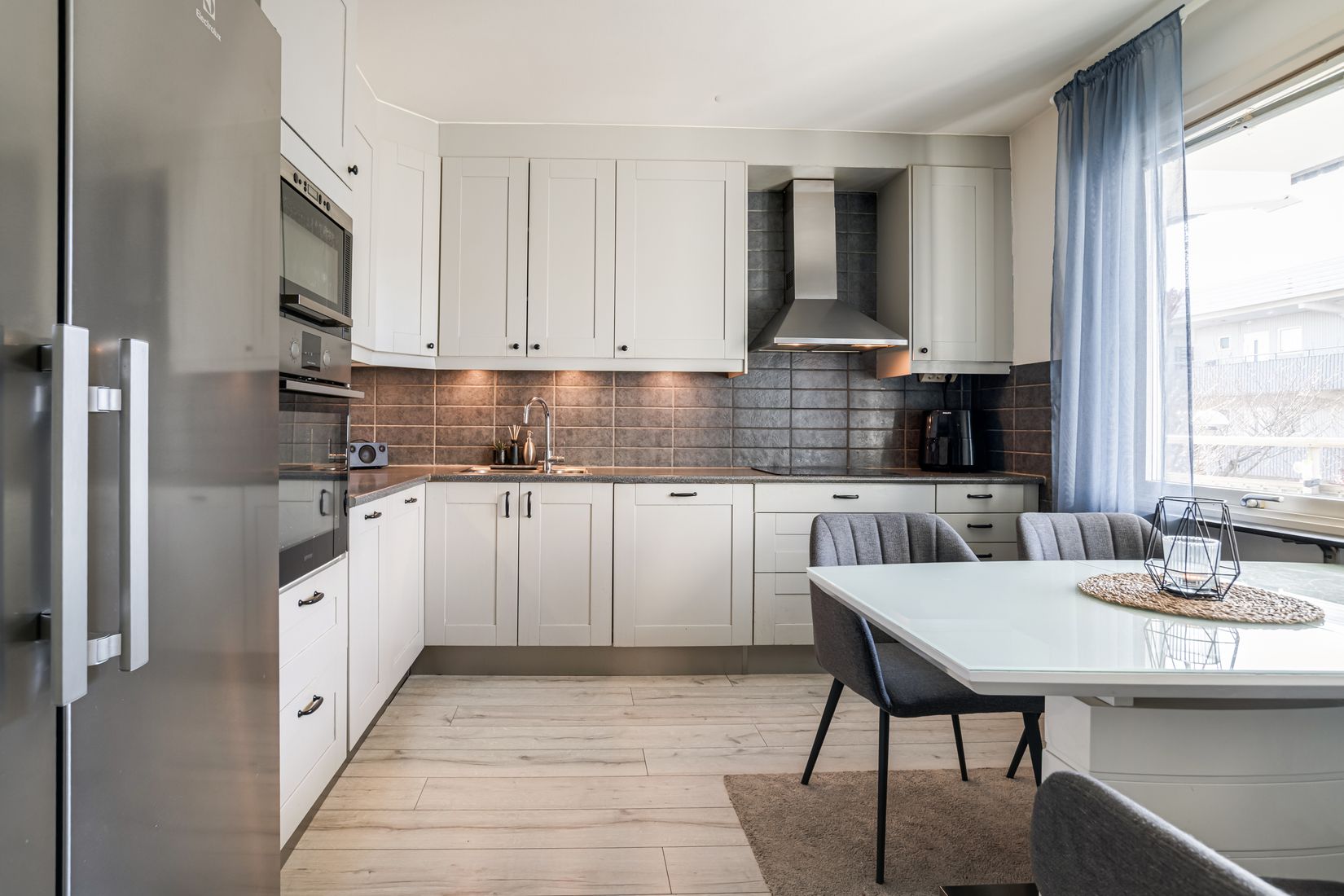 Denna typ av lägenhet är både sällsynt och eftertraktad i området, vilket skapar ett hem med extra flexibilitet för familjen eller den som behöver flera rum. Bostaden erbjuder tre lättmöblerade sovrum, varav ett större master bedroom med goda förvaringsmöjligheter. Köket är rymligt och har plats för matgrupp. Det ljusa vardagsrummet ger generösa sällskapsytor för både familj och vänner. Badrummet är smakfullt renoverat och utrustat med tvättmöjligheter, vilket bidrar till en smidig vardag.