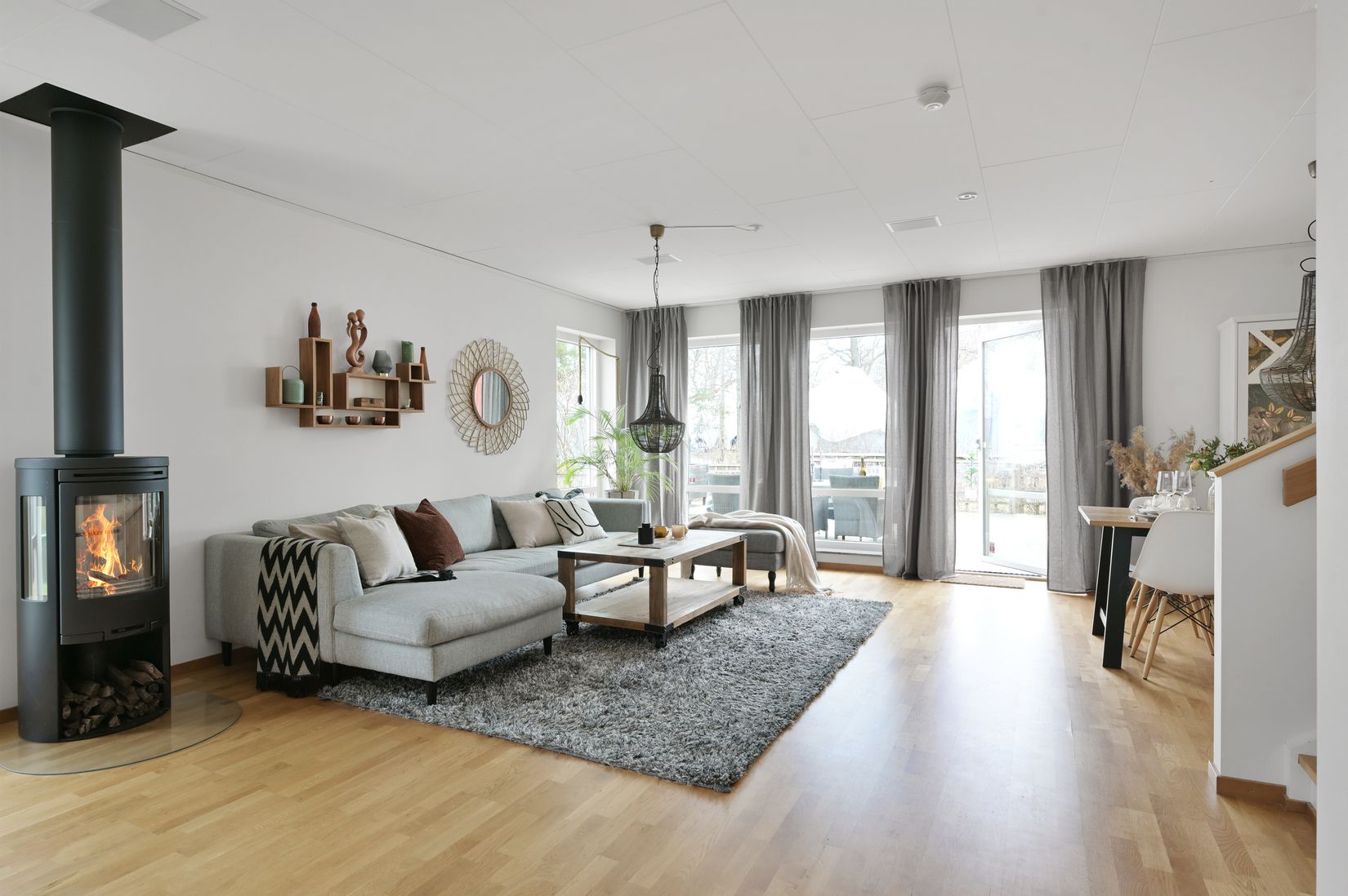 Bostaden är dynamisk utformad och erbjuder inte mindre än fyra generösa sovrumsmöjligheter, två badrum, gott om förvaring, minimalistiskt och förvaringseffektivt kök och stora sociala ytor med vacker braskamin på entréplanet. Genomgående påkostade materialval och tekniska inslag som förstärker bostadsupplevelsen.