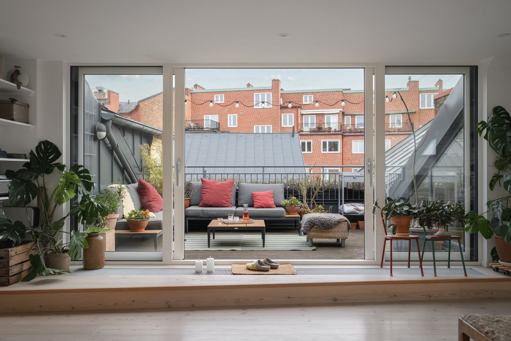 De stora skjutbara glaspartierna suddar ut gränsen mellan inne och ute och låter ljuset flöda fritt genom rummen. Takterrassen, som vetter mot lugnt gårdsläge, erbjuder gott om plats för både loungemöbler och planteringar, en privat oas som bjuder in till långa sommarkvällar, middagar under bar himmel och avkopplande stunder i solen.