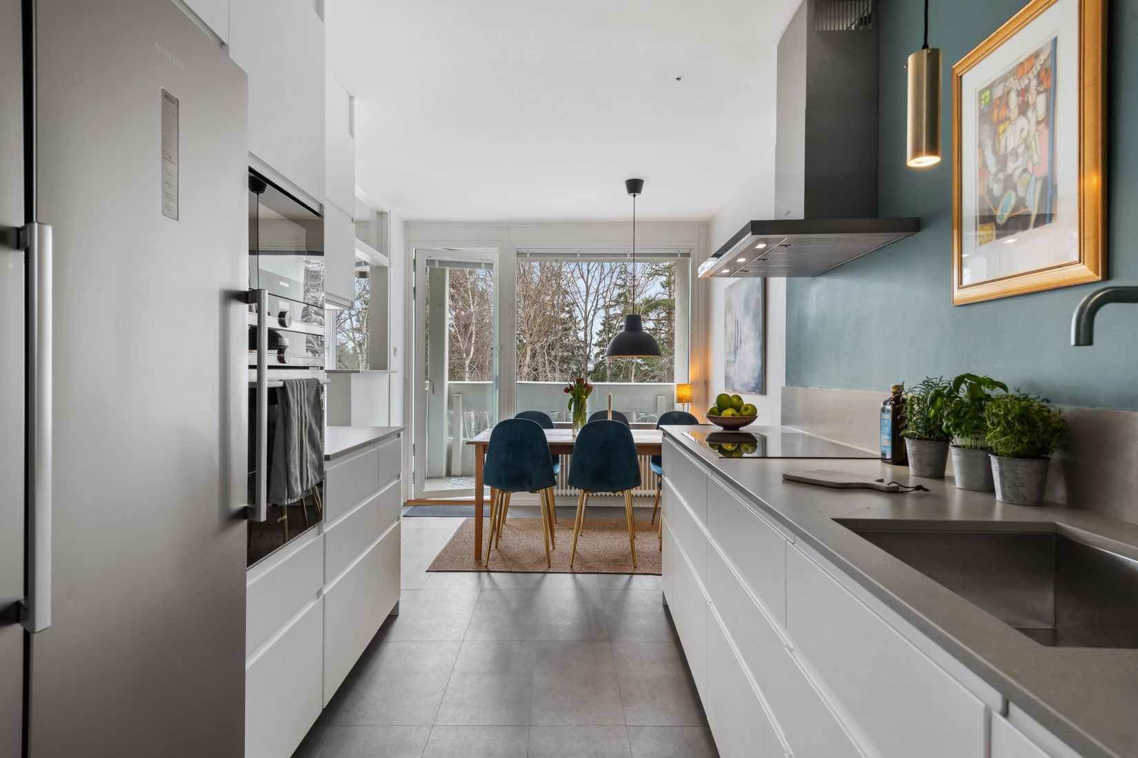 Det som verkligen utmärker bostaden är de generösa ljusinsläppen och den härliga dubbelbalkongen i bästa sydvästläge, som nås både från kök och vardagsrum. Här kan du njuta av sol större delen av dagen. Det höga och insynsskyddade läget med utsikt mot grönområde ger en lugn och trivsam atmosfär där du kan följa årstidernas skiftningar.