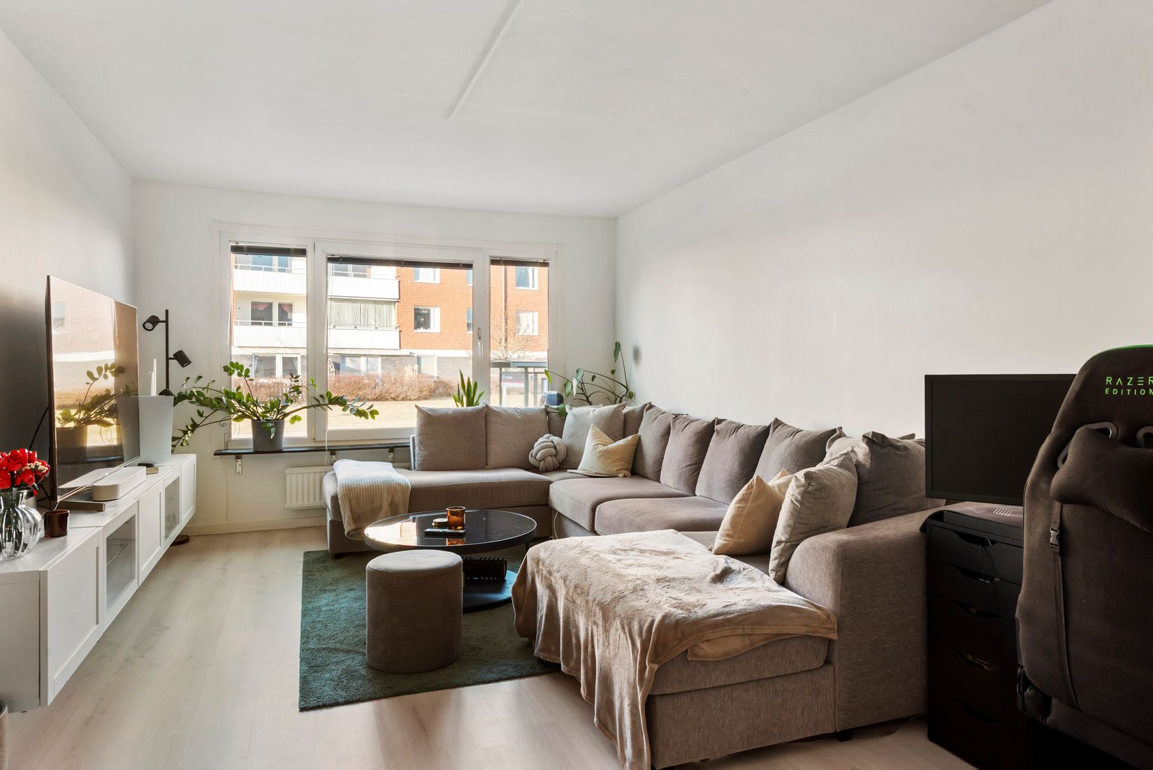 Köket har en varm och hemtrevlig karaktär med träfärgade luckor, ljust kakel ovanför arbetsytorna, bänkskiva i laminat med stora arbetsytor. Härifrån nås även en separat tvättstuga/grovkök som underlättar vardagen. Vardagsrum och sovrum har ljusa laminatgolv som tillsammans med de neutrala väggarna ger ett stilrent intryck. Sovrummet är rymligt och har direkt access till bostadens balkong i soligt söderläge – en perfekt plats att njuta av dagens ljusa timmar. Det mindre rummet passar utmärkt som barnrum, arbetsrum eller gästrum. Duschrummet är funktionellt utrustat med våtrumsmatta och våtrumstapet samt WC, handfat med kommod, badkar och spegelskåp. Hallen välkomnar med ett slitstarkt svart klinkergolv och ljusa väggar samt bra plats för avhängning.