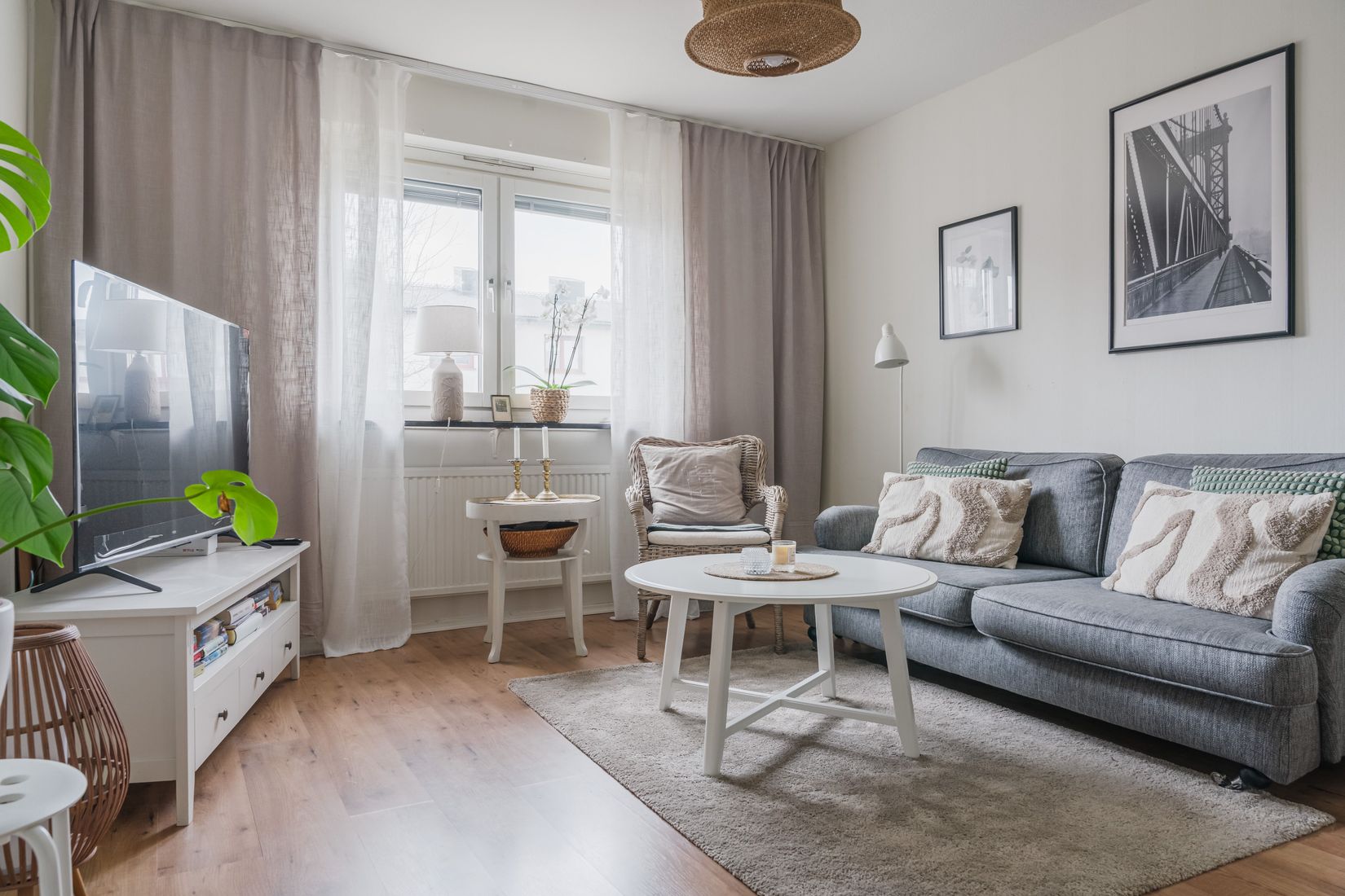 Denna ljusa bostad upplevs betydligt rymligare än vad boytan antyder. Redan i hallen hittar du smarta förvaringslösningar i form av vita, inbyggda garderober. Det intilliggande köket är praktiskt och stilrent inrett med vita luckor. Vardagsrummet utgör lägenhetens hjärta och har ett härligt ljusinsläpp från fönsterpartiet. Här har du gott om plats för soffgrupp och umgänge. En mycket smart och uppskattad detalj är sovalkoven som enkelt kan skärmas av med draperier, vilket ger en avskild och mysig sovplats. Badrummet är ljust och helkaklat och är dessutom utrustat med en egen tvättmaskin som förenklar vardagen.