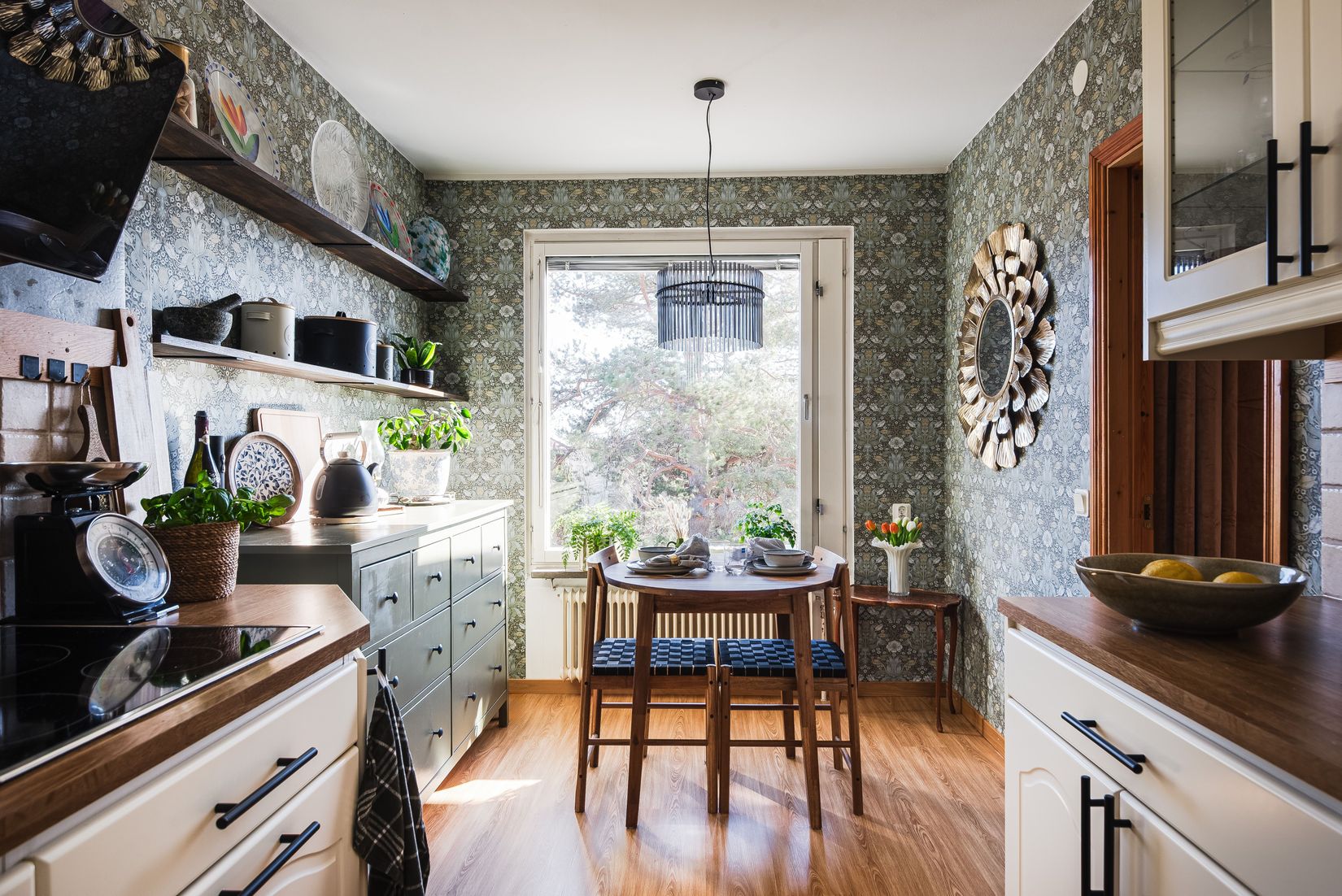 Vardagsrummet är rymligt och lättmöblerat med plats för både soffgrupp och matdel. Köket är funktionellt och erbjuder bra arbetsytor samt plats för matbord.