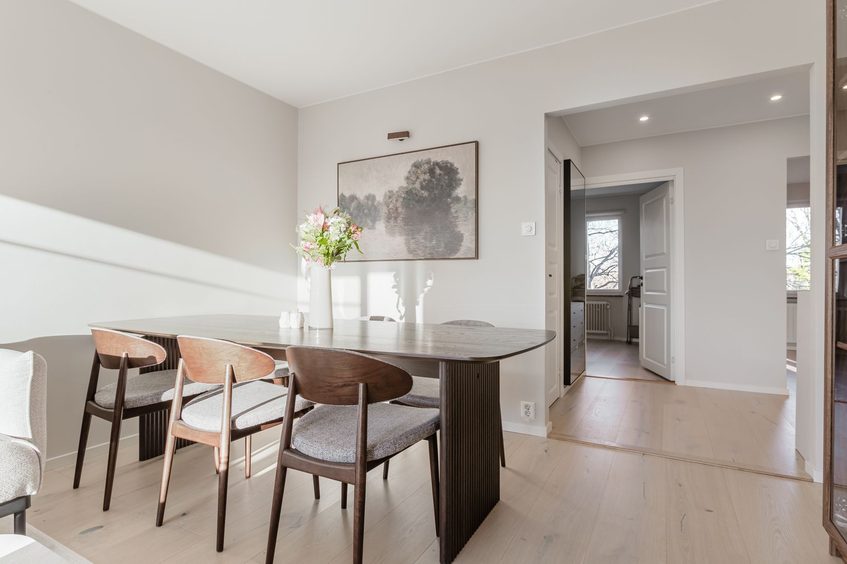 Bostaden har en funktionell planlösning med tydlig uppdelning mellan sociala ytor och sovrum. Vardagsrummet är rymligt med plats för både soffgrupp och matbord. Intill ligger köket, som erbjuder bra arbetsytor och plats för matgrupp vid fönster.
