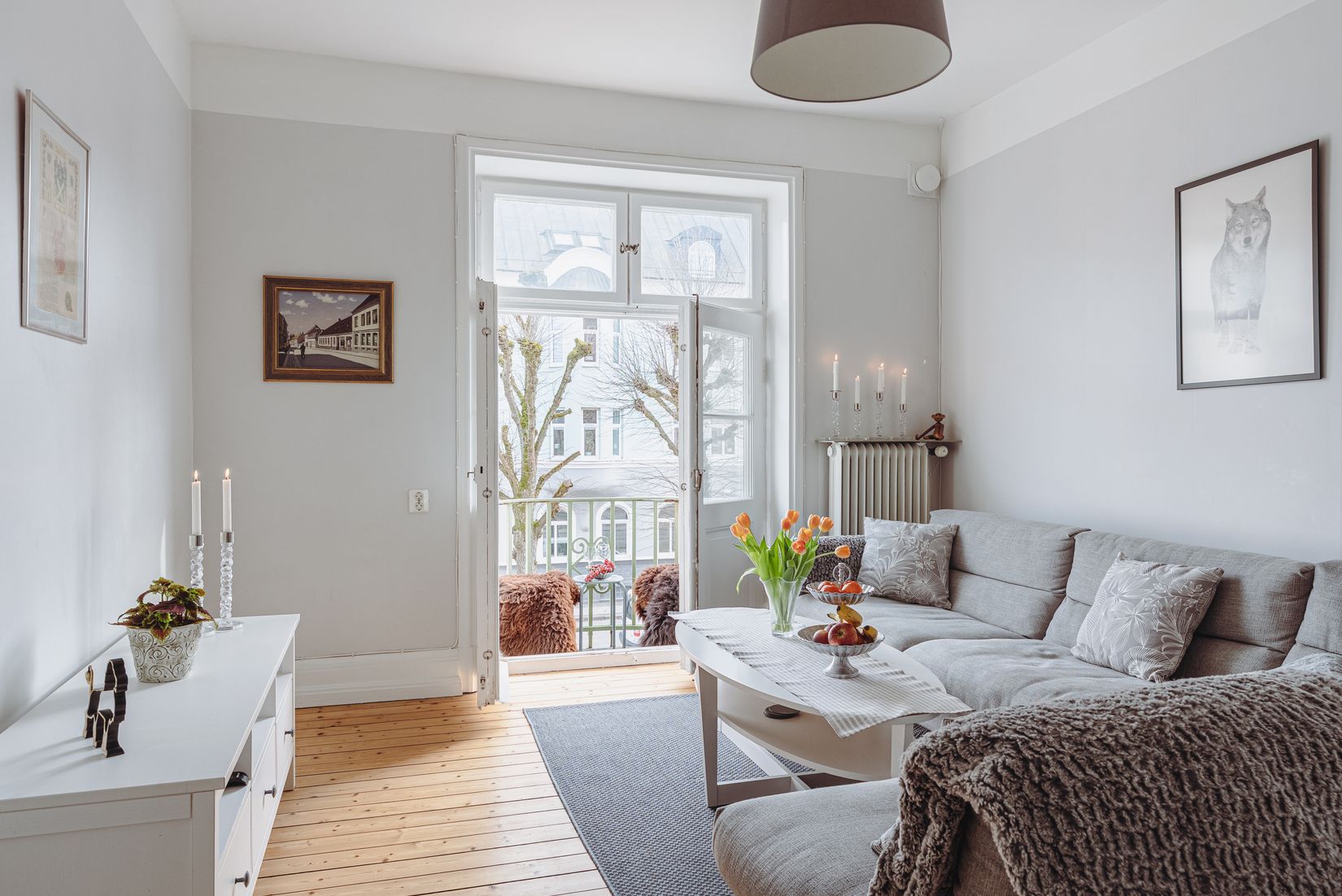 Vardagsrummet är rymligt och lättmöblerat med gott om plats för både soffgrupp och mediemöbler. Härifrån nås den franska balkongen som släpper in rikligt med ljus och erbjuder en fin vy mot den omgivande miljön – en perfekt plats att öppna upp mot under årets varmare månader.