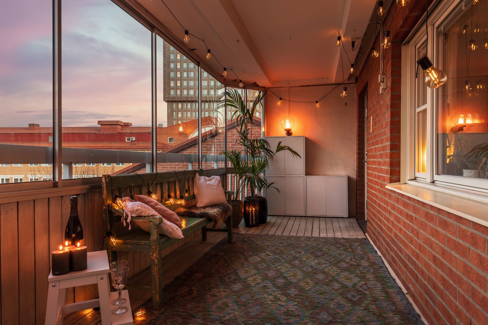 Stor, härlig inglasad balkong med utsikt över himmel och omgivningar. Plats för bord, stolar, växtligheter, en riktig oas om sommaren.