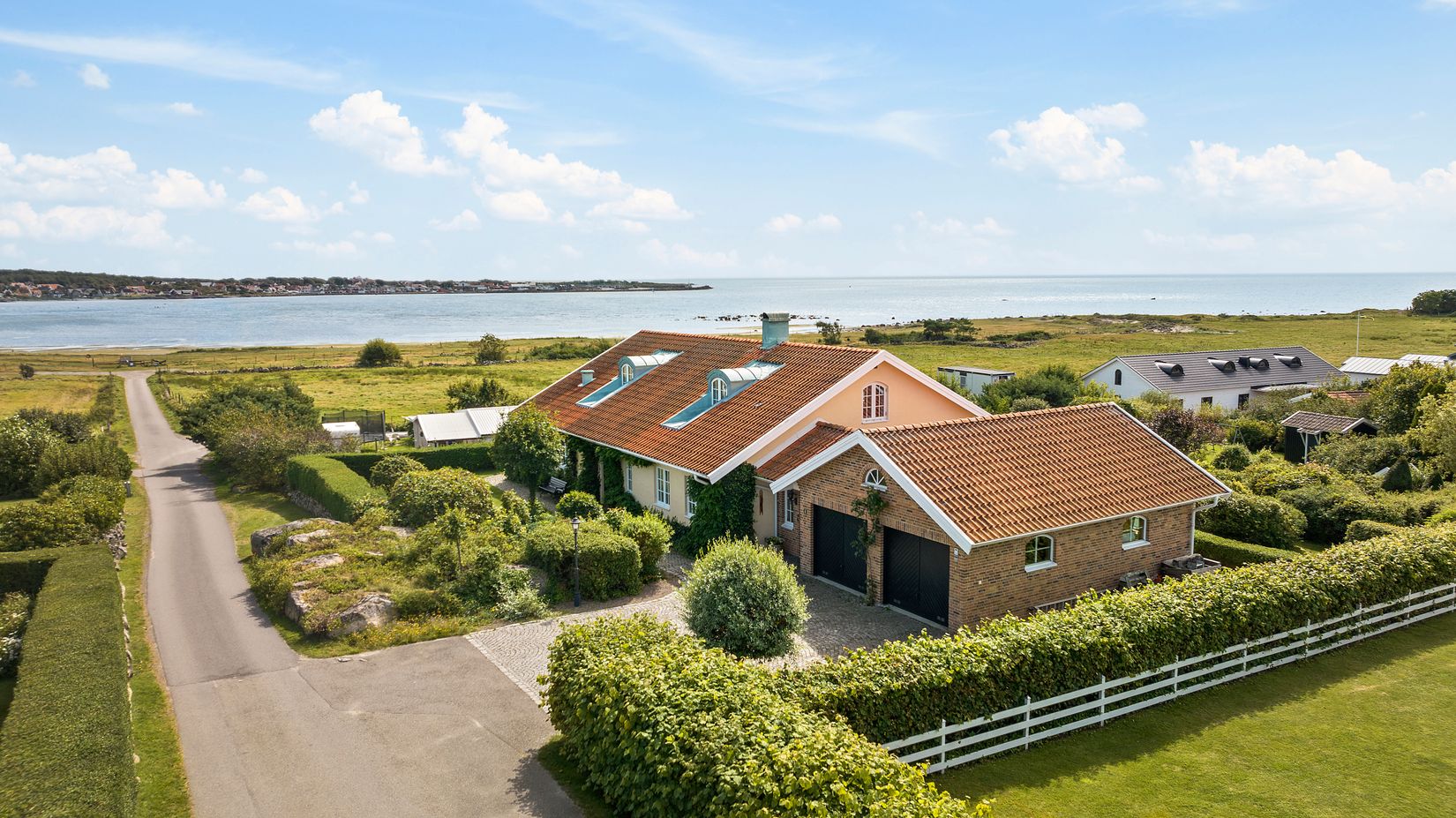 Välkommen till denna pampiga villa om 244 kvm, belägen i ett havsnära, lantligt landskap där grönskan omfamnar fastigheten och den höga placeringen erbjuder en imponerande utsikt. Knappt 100 meter söderut öppnar sig de vidsträckta strandängarna och havet med Träslövsläges siluett som bakgrund. En vy som är en del av vardagen, både inifrån huset och från terrassen som breder ut sig i väster.