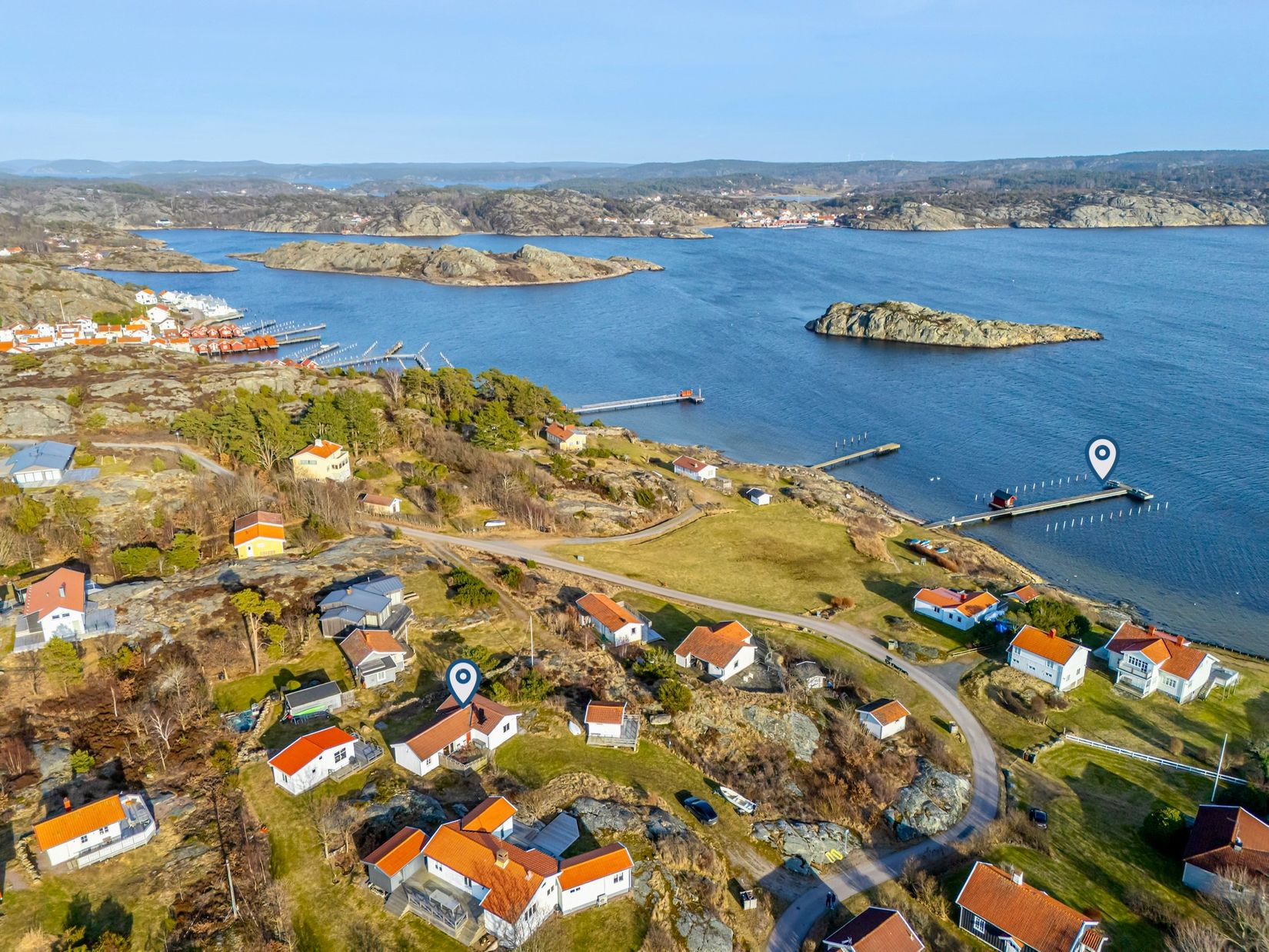 Här får ni ett sällsynt boende med tre separata hus: ett charmigt huvudhus på cirka 70 kvm med tre sovrum och ett ljuvligt allrum där den magiska utsikten över fjorden tar andan ur en, ett nyrenoverat gästhus på 15 kvm samt ett modernt Attefallshus på 30 kvm från 2021.