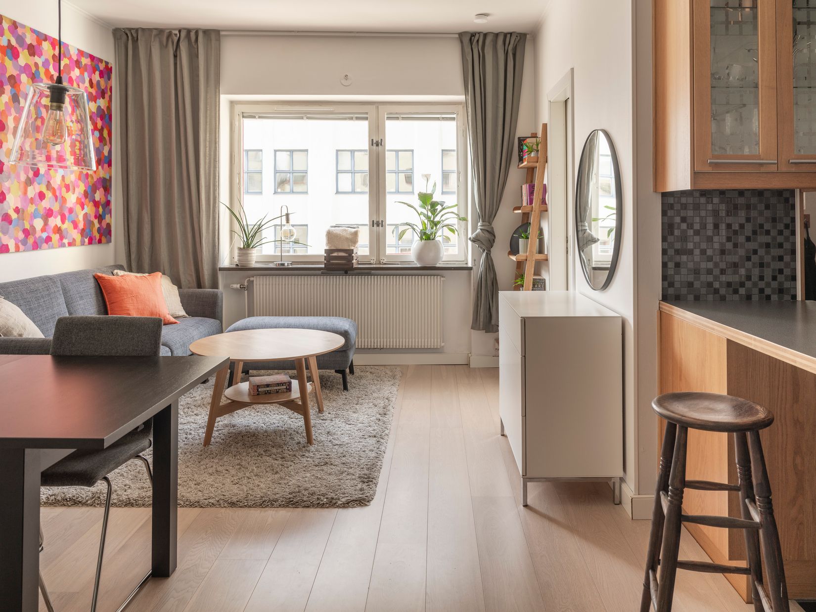 Bostadens hjärta utgörs av det luftiga vardagsrummet i öppen planlösning mot köket. Ett stort fönsterparti med fönsterbänk i sten ger ett fint ljusinsläpp och förstärker den rymliga känslan. Här finns plats för både soffgrupp och matbord, vilket skapar en naturlig samlingspunkt för såväl vardag som sociala tillfällen.