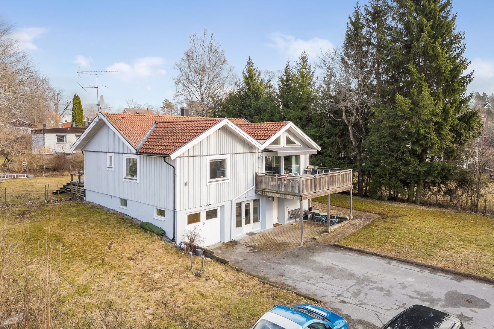 På övre plan öppnar huset upp sig med en ljus och luftig känsla. Vardagsrummet har öppen planlösning mot köket, ekparkett på golvet, öppet till nock i delar av rummet och utgång till balkongen. Köket är välutrustat med bänkskivor i massiv ek, diskho och glaskeramikhäll på halvö, side-by-side kyl/frys från SMEG, diskmaskin från Bosch och ångugn från Whirlpool. Härifrån nås även altanen på baksidan, perfekt läge med morgon- och förmiddagsol. Övre plan erbjuder tre rymliga sovrum, samt ett tidigare entrérum som kan användas som sovrum, kontor eller återställas som entré. WC med dusch finns också på detta plan, praktiskt placerad nära sovrumsdelen.