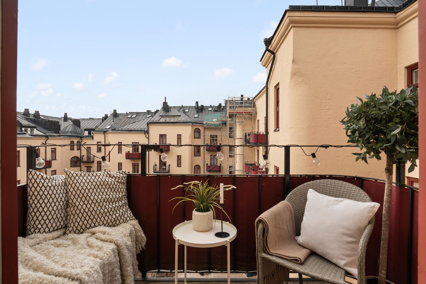Från rummet nås den underbara balkongen mot den rofyllda innergården, där du kan njuta av eftermiddags- och kvällssolen i en skyddad och harmonisk miljö, en självklar favoritplats under årets varmare månader.