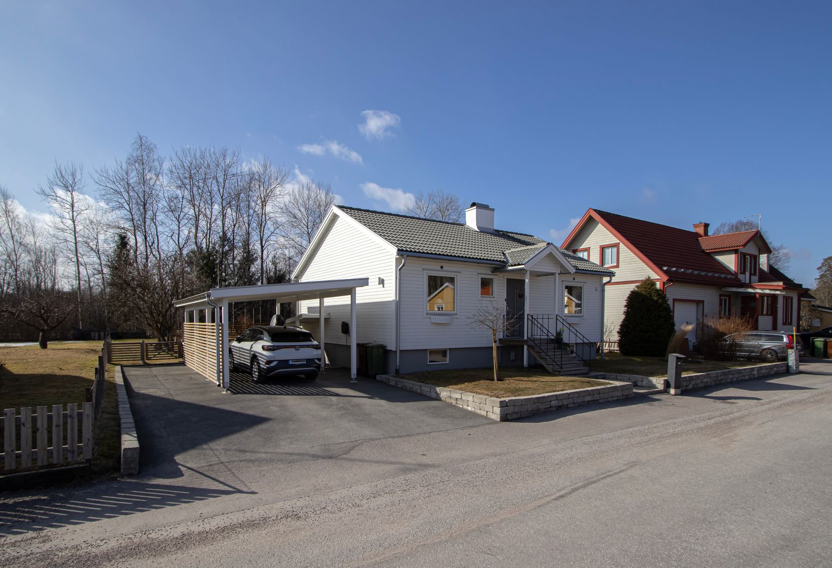 Trädgårdens 970 kvm har större delen av ytan på baksidan där ni har ni stor gräsyta, ett äppelträd, vacker rabatt med perenner, stort trädäck och detta ramas in med staket och grindar så ni tryggt kan låta barnen springa ut på altanen och baksidan samt för de fyrbenta familjemedlemmarna. På framsidan har ni stenmur mot gatan, stenplattor mot trappan och entrén samt asfalterad uppfart med plats för flera bilar samt plats för en bil i carporten.