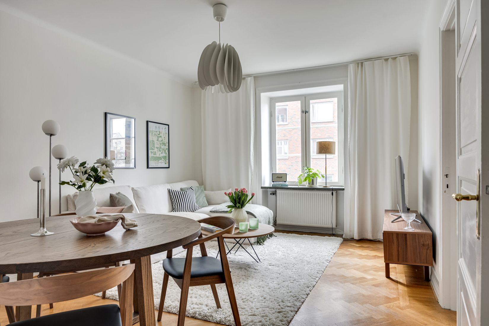 Bostaden präglas av vackra originaldetaljer såsom spegeldörrar, generös takhöjd, djupa fönsternischer och fiskbenslagd ekparkett – attribut som tillsammans skapar en varm och inbjudande atmosfär. De två rummen ligger i fil och de stora fönsterpartierna i väster ger ett härligt ljusinsläpp som fyller hemmet under eftermiddag och kväll.