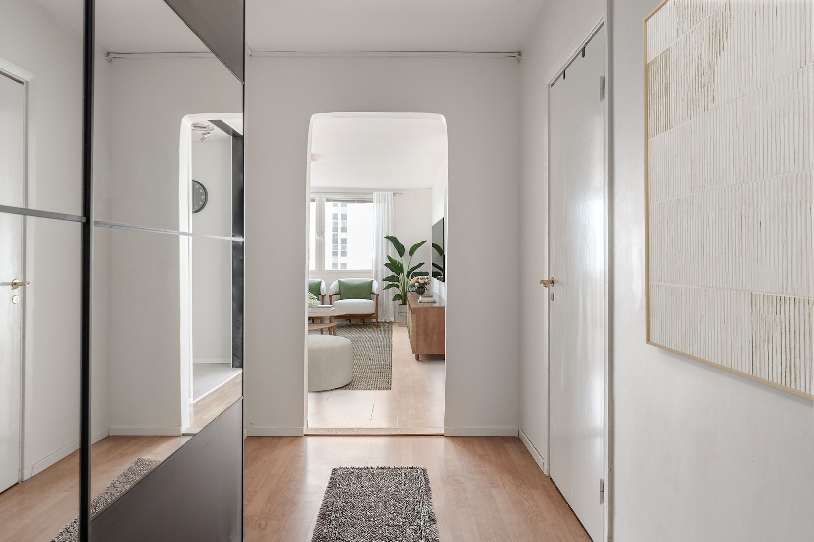 Det rymliga vardagsrummet erbjuder gott om plats för både soffgrupp och matplats, vilket gör det till en perfekt samlingspunkt för både vardag och umgänge. Köket är funktionellt med goda arbetsytor och plats för matbord. Sovrummet är rofyllt och har plats för dubbelsäng. Det finns en stor klädkammare för förvaring i lägenheten. Badrummet är helkaklat och bostaden har genomgående ett trivsamt och välhållet skick.