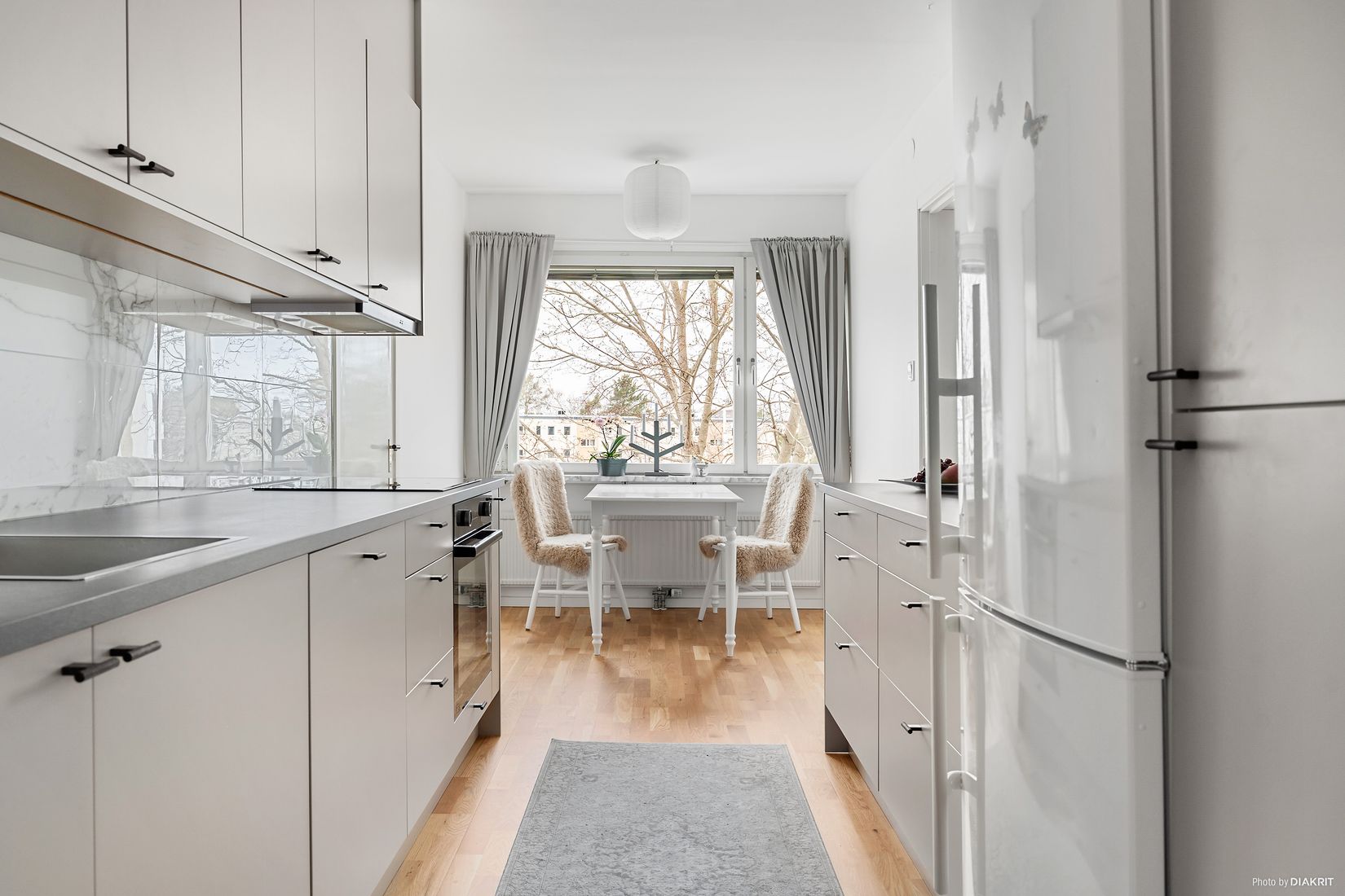 Köket är stilrent renoverat 2023 med generösa arbetsytor, gott om förvaring och plats för matbord vid fönster. Stambytt badrum från 2013 med kakel och klinker samt tvättmaskin som inte är använd.