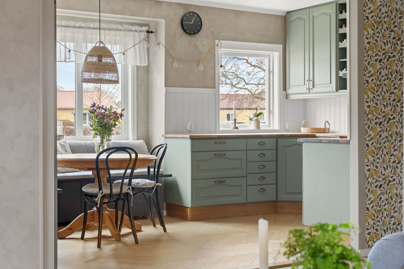Bostaden erbjuder tre sovrum och präglas av en delvis öppen planlösning mellan kök och vardagsrum, vilket skapar en mycket trevlig och social atmosfär. I vardagsrummet finns även en stämningsfull braskamin som ger både värme och en mysig känsla under årets kallare månader.