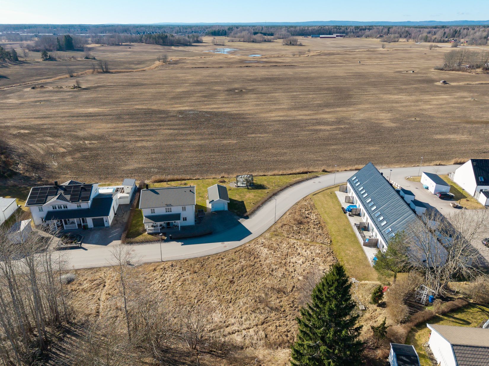Tomten gränsar till grönområden på sidan, vilket innebär att ingen framtida bebyggelse kommer att uppföras där – en unik fördel som skapar en luftig, insynsskyddad boendemiljö.