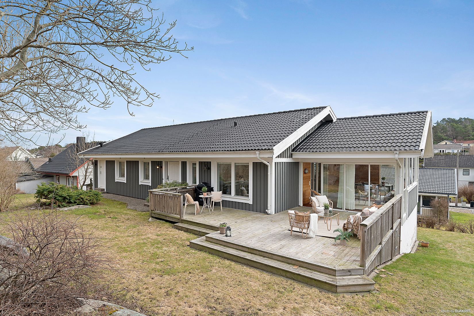 Entréplanet präglas av ljus och rymd med stora fönsterpartier som släpper in rikligt med dagsljus och skapar en härlig kontakt med omgivningen. Här finns generösa sociala ytor där kök och vardagsrum samspelar på ett naturligt sätt – perfekt för både vardagsliv och sociala tillställningar. Från bostaden nås även en härlig altan samt ett inglasat uterum som förlänger säsongen och erbjuder en fantastisk plats att njuta av utsikten året runt.