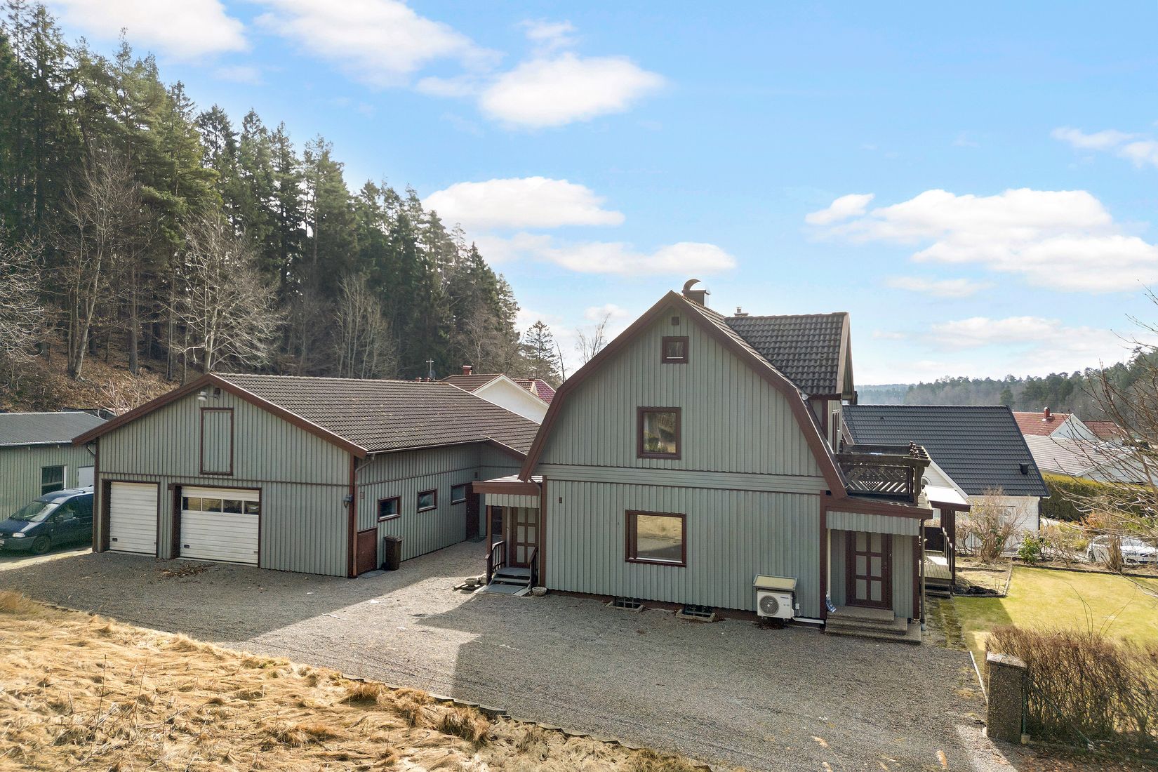 Utöver bostadshuset finns en stor verkstadsbyggnad med verkstad/lager, kontorsrum med toalett, två garage samt förråd med total yta om cirka 150 kvm! Vindsutrymmet en trappa upp ger ytterligare gott om förvaringsmöjligheter då denna golvyta är totalt cirka 130 kvm. Perfekt för dig med verksamhet eller intresse för snickeri eller annat hantverk!