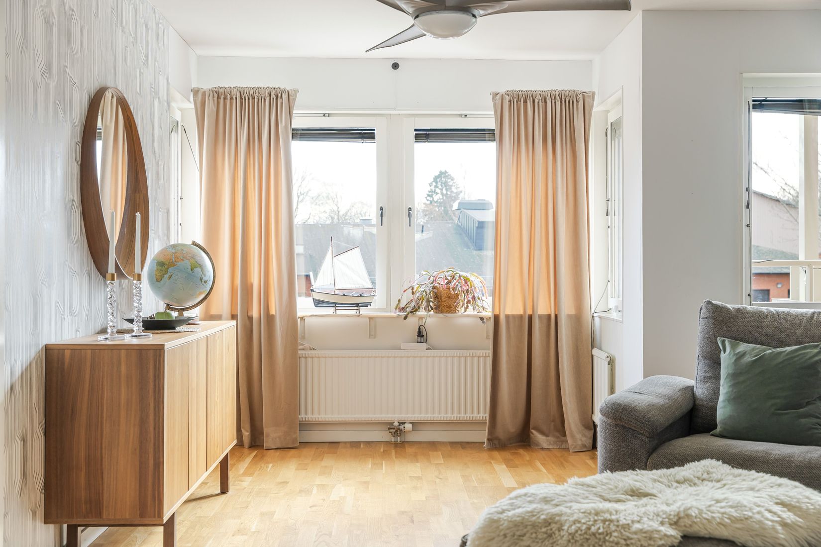 Vardagsrummet är stort, ljust och lättmöblerat med fina sällskapsytor och ett härligt ljusinsläpp. Härifrån når du den andra balkongen som med sitt soliga läge blir en naturlig förlängning av rummet under årets varmare månader. Ljusa väggar och ekparkett löper vidare och skapar en enhetlig och harmonisk känsla.
