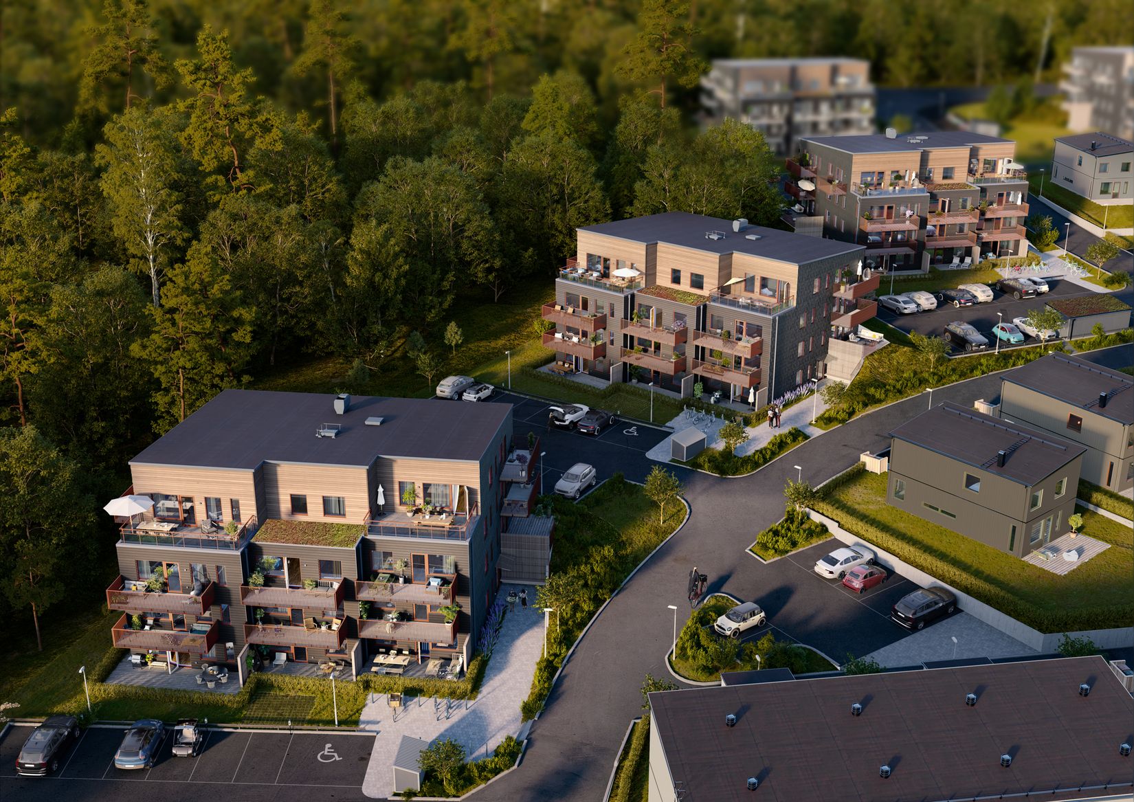 En av bostadens stora höjdpunkter är den generösa uteplatsen som löper runt huset. Framsidan ligger i ett härligt västerläge där du kan njuta av solen under eftermiddag och kväll – perfekt för middagar, umgänge och avkoppling. Uteplatsen erbjuder även möjlighet att nyttja ytorna runt huset och skapa flera olika sittplatser i ett lugnt och avskilt läge. Härifrån nås dessutom en stor gemensam gräsmatta, perfekt för lek och aktivitet.