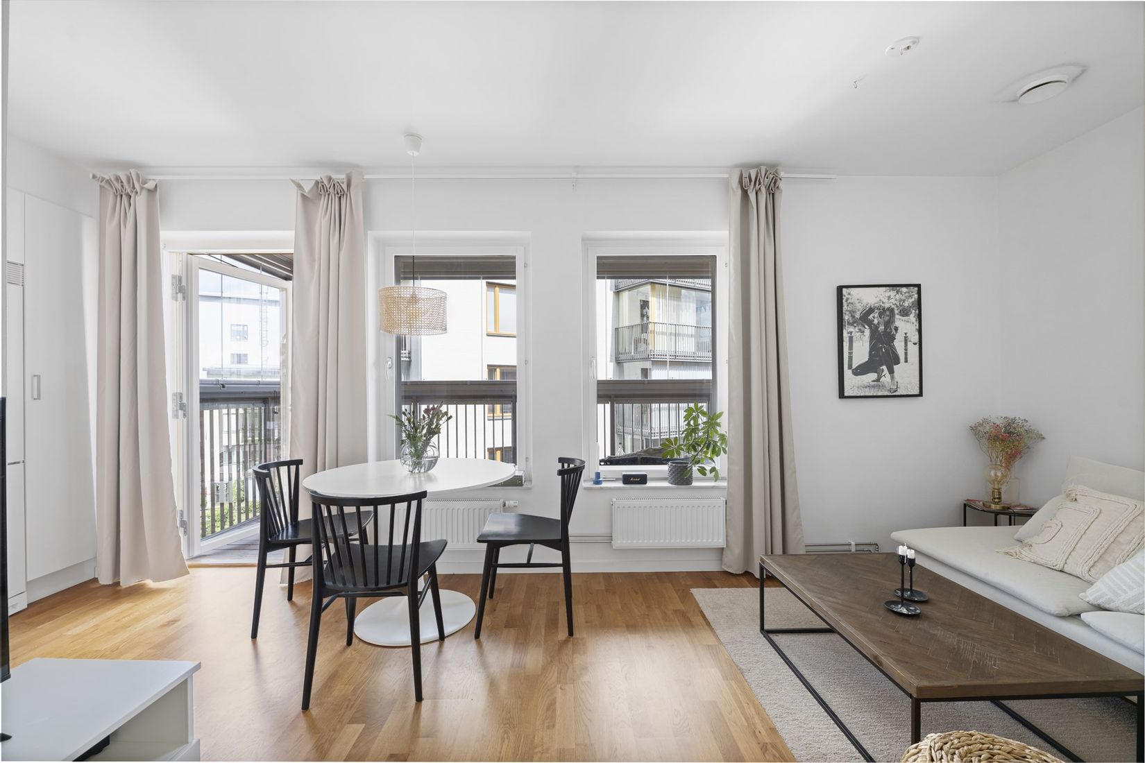 Planlösningen erbjuder en generös hall med smart förvaring i rymlig klädkammare och praktiskt klinkergolv. Det moderna ljusa köket som sammanfogas med vardagsrummet har ett fint ljusinsläpp från generösa fönsterpartier. Härifrån nås även den härliga balkongen som vetter ut mot den grönskande innergården. Balkongen bildar ett extra rum under varma sommarmånader och med sin praktiska inglasning finns här möjlighet att nyttja den större delar av året. Vidare finns praktiskt utrymme för en större säng. Det helkaklade sobra badrummet, som nås från hallen, har allt man kan tänkas behöva, gott om förvaring i skåp samt både tvättmaskin och torktumlare för att underlätta vardagsbestyren! I huset finns hiss som går ända ner i källaren där föreningen har en del av sina parkeringar för uthyrning.