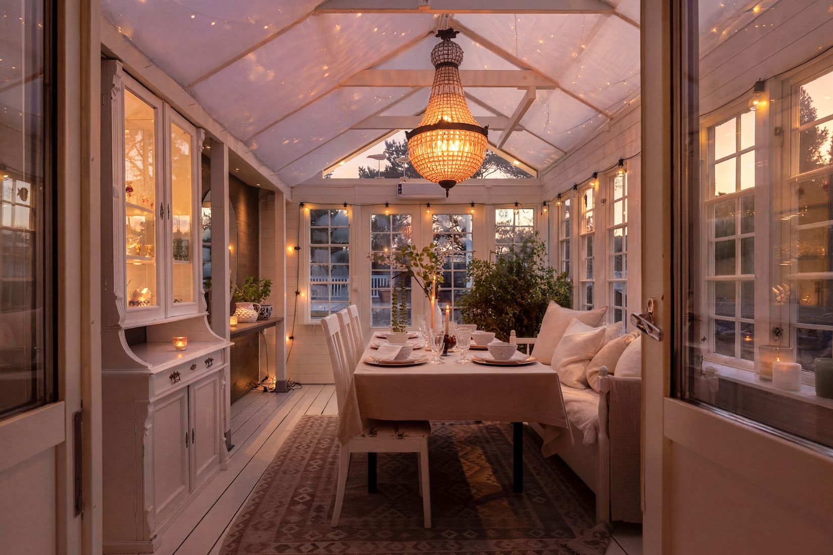 Huset bjuder på två generösa inglasade utemiljöer i form av ett uterum och ett orangeri, som skapar naturliga förlängningar av bostadens sociala ytor samt suddar ut gränsen mellan inne och ute. Njut av långa frukostar, middagar med vänner och stillsamma stunder året om, skyddad från både vind och väder. Den mysiga balkongen med havsutsikt blir en given favoritplats – perfekt för morgonkaffe eller ett glas vin medan solen sänker sig över trädtopparna.