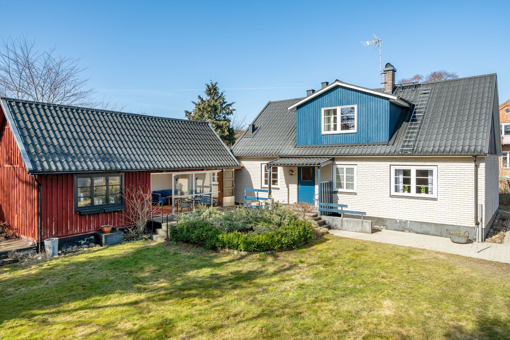 I vinkel till huset finns en äldre länga som en gång i tiden blev ombyggt till isolerat hobbyrum och ett stort uterum som är öppet upp i nock, med infällt ljusinsläpp i taket.