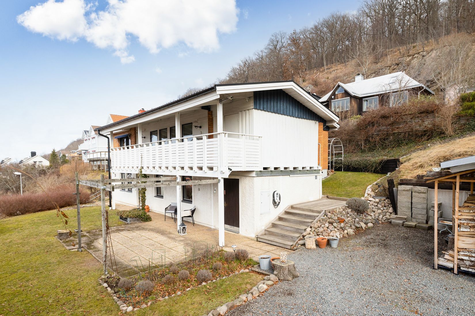På husets baksida väntar en trivsam altan med plats för grill och utemöbler. Här kan du njuta av en privat och skyddad miljö med en glimt av den fina utsikten över Huskvarna och Vättern – en idealisk plats för sommarens måltider och avkopplande stunder med familj och vänner.