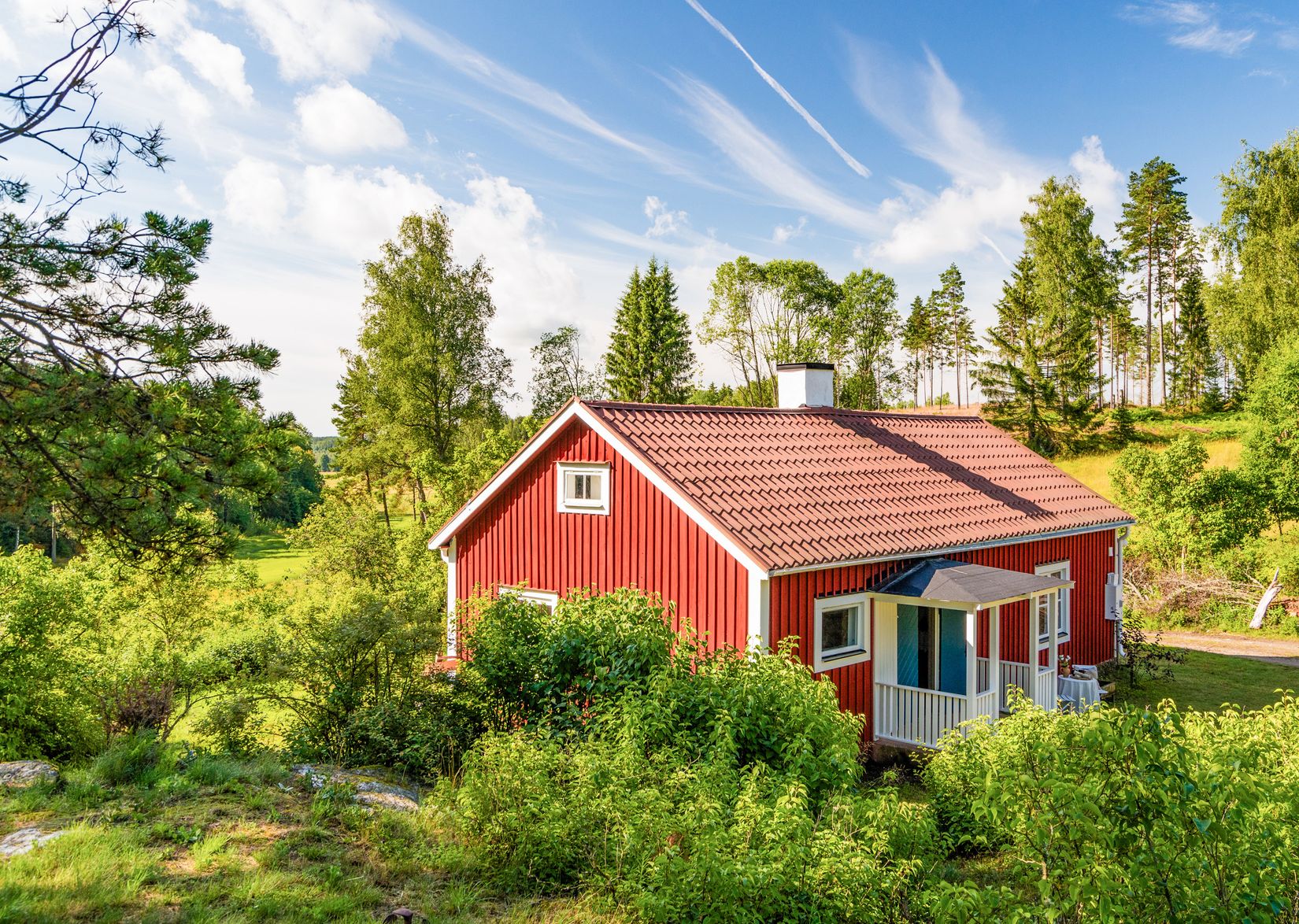 Den klassiska röda stugan med vita knutar ligger fint placerad på tomten med utsikt över det vackra landskapet. Vid entrén finns en mindre veranda som blir en naturlig plats för morgonkaffet eller sommarkvällar i solen.