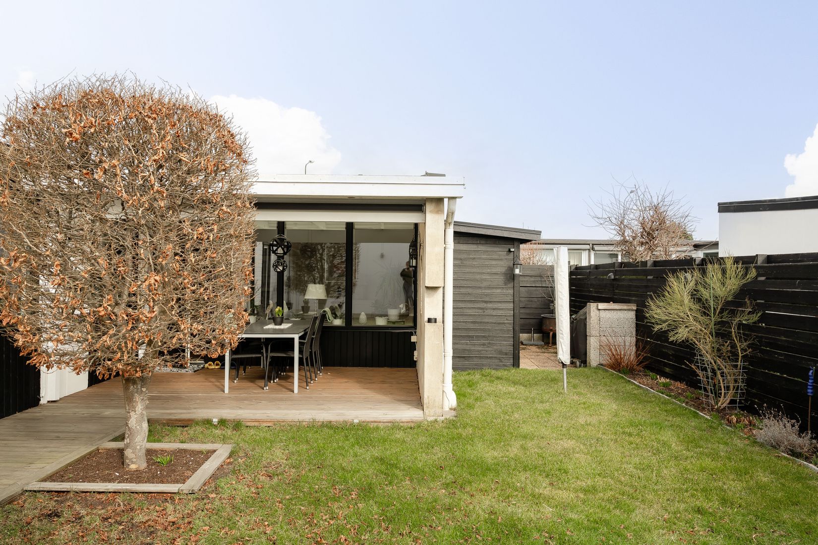 Bostadens hjärta utgörs av de sociala ytorna där vardagsrum och matplats möts i en öppen och luftig planlösning. De låga fönsterpartierna släpper in rikligt med dagsljus och skapar en naturlig kontakt med trädgården utanför. Härifrån nås den insynsskyddade uteplatsen som förlänger sällskapsytorna under årets varmare månader och bjuder in till såväl avkoppling som umgänge.