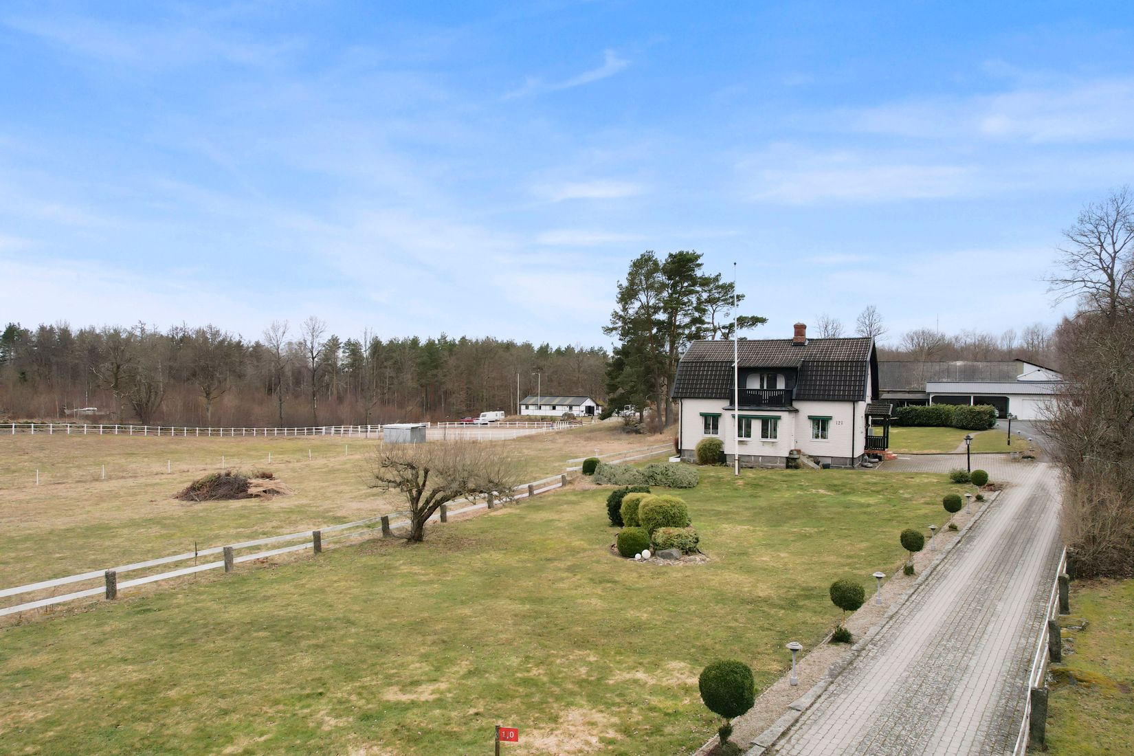 Fastigheten har två separata infarter med möjlighet att köra runt. Den ena leder direkt till bostadshuset medan den andra ansluter till stallet. Detta ger en praktisk och genomtänkt disposition där stall och bostad samspelar väl, samtidigt som det underlättar exempelvis uthyrning av stallplatser utan att trafik behöver passera bostadshuset.