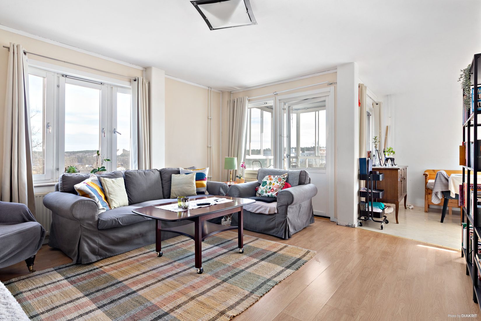 Lägenhetens hörnläge skapar ett fantastiskt ljusinsläpp och en luftig, inbjudande känsla med många möbleringsmöjligheter. Här finns gott om plats för både vardagsliv och sociala tillställningar. Den rymliga inglasade balkongen i hörnläge är något alldeles extra, med fin utsikt mot Flottsbro och omgivande grönska blir det en perfekt plats för avkoppling efter en lång dag.