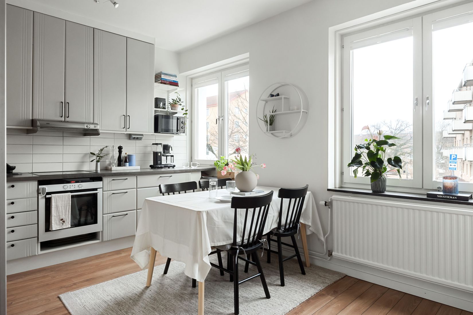 Köket är ljust och funktionellt utformat med grå skåpsluckor och en praktisk L form som ger både bra arbetsytor och god förvaring. Två stora fönster förstärker känslan av rymd och gör rummet extra inbjudande. Bostaden rymmer två bra sovrum där det större vetter mot innergården och erbjuder en rofylld miljö samt gott om förvaring i garderober längs ena väggen. Det andra rummet är flexibelt och passar lika bra som barnrum, gästrum eller arbetsrum.