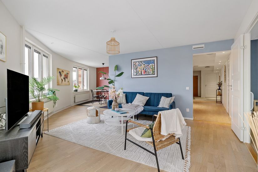 Vardagsrummet är luftigt och inbjudande med direkt access till den stora inglasade balkongen, som fungerar som ett extra rum stora delar av året. Här kan ni njuta av lugna morgnar såväl som sena sommarkvällar.