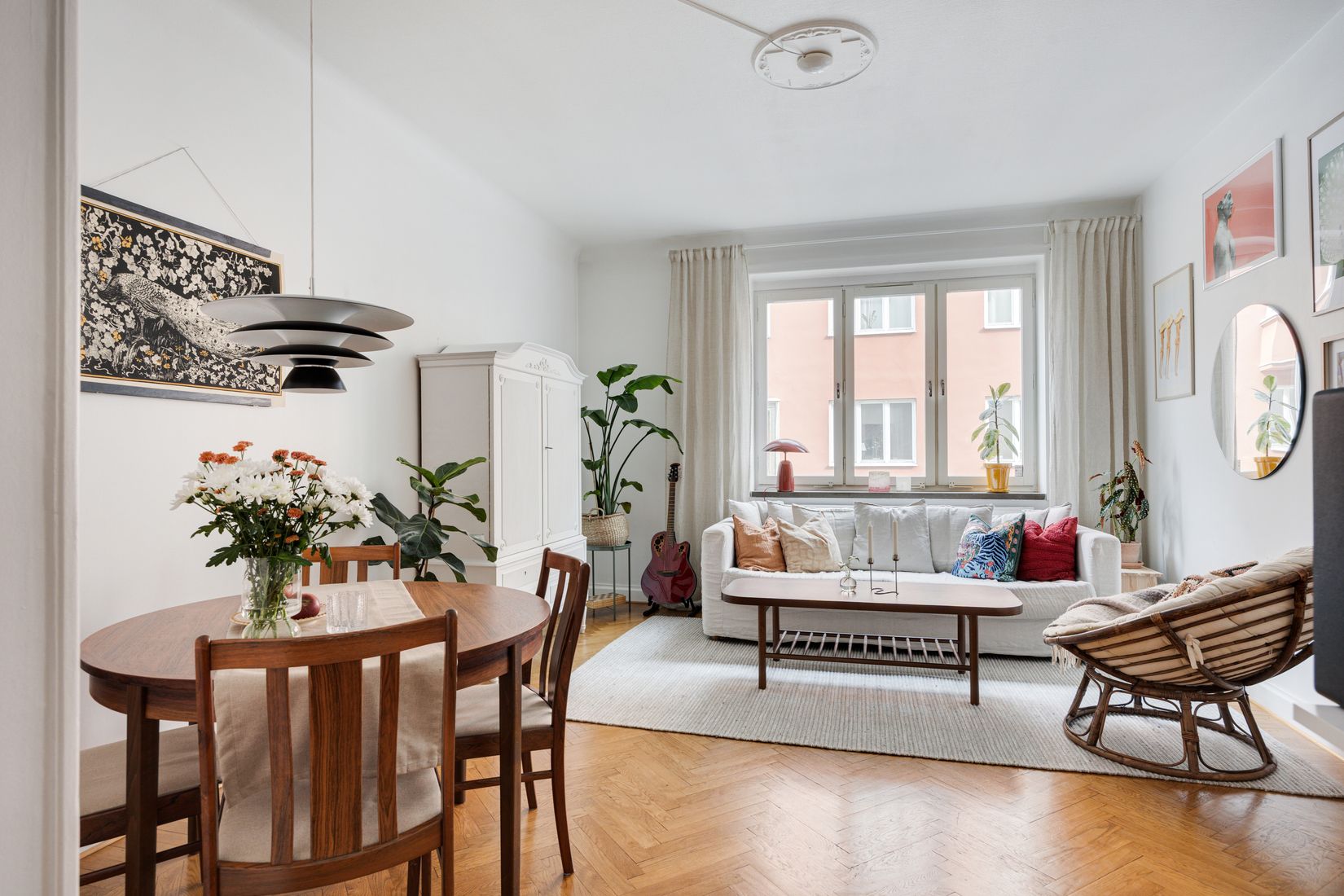 Vardagsrum - Socialt vardagsrum med plats för både matbord och soffgrupp. Vacker fiskbensparkett och en lamprosett i taket.
