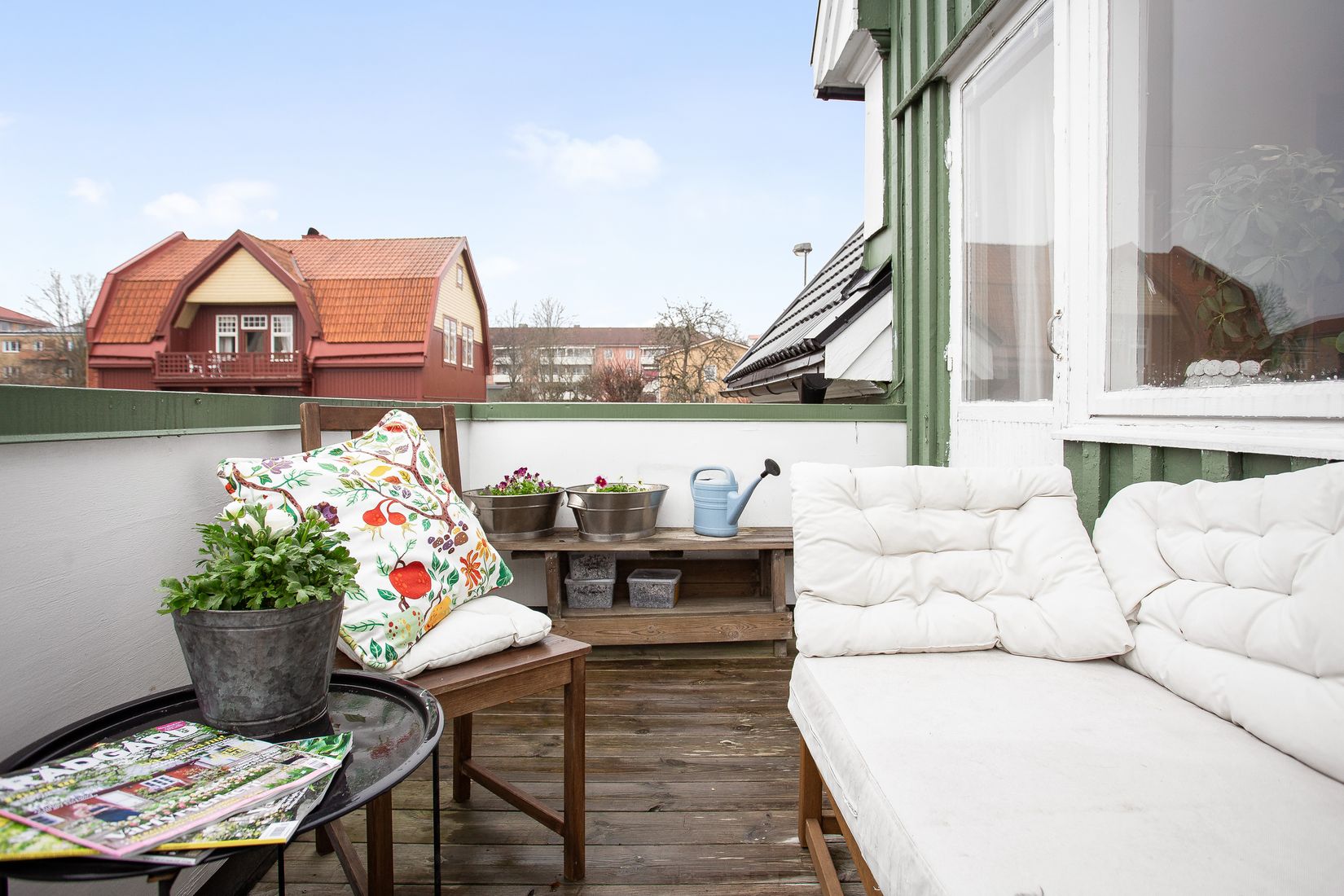 Den generösa, terrassliknande balkongen i söderläge blir en naturlig förlängning av bostaden under årets varmare månader – här njuter du av solen större delen av dagen med utsikt över den stillsamma omgivningen.