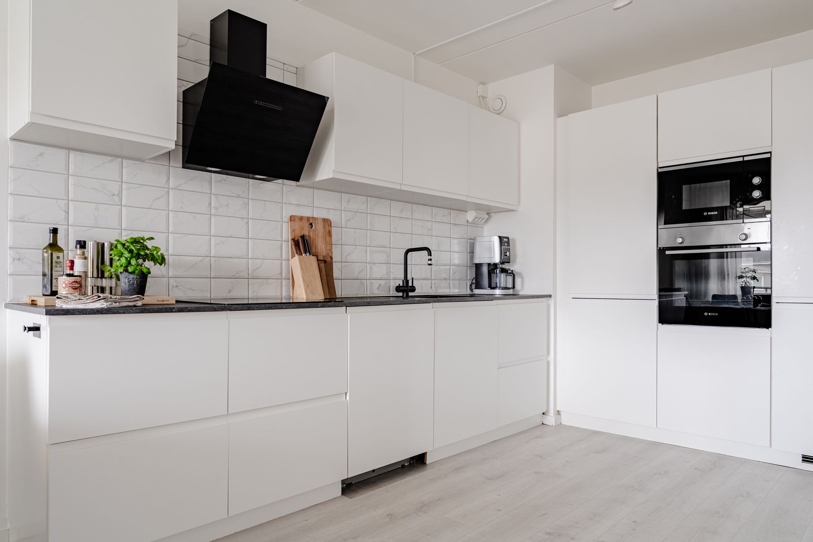 Vidare in i bostaden öppnar vardagsrummet upp sig - ett ljust och inbjudande rum med gott om plats för både avkoppling och sociala tillfällen. Härifrån skapas en naturlig koppling till det stilrena köket, som går i en smakfull kombination av vita luckor och en mörkare bänkskiva som harmoniserar fint med resten av hemmet. Köket erbjuder bra arbetsytor och plats för matbord, vilket gör det till en naturlig samlingspunkt i vardagen.