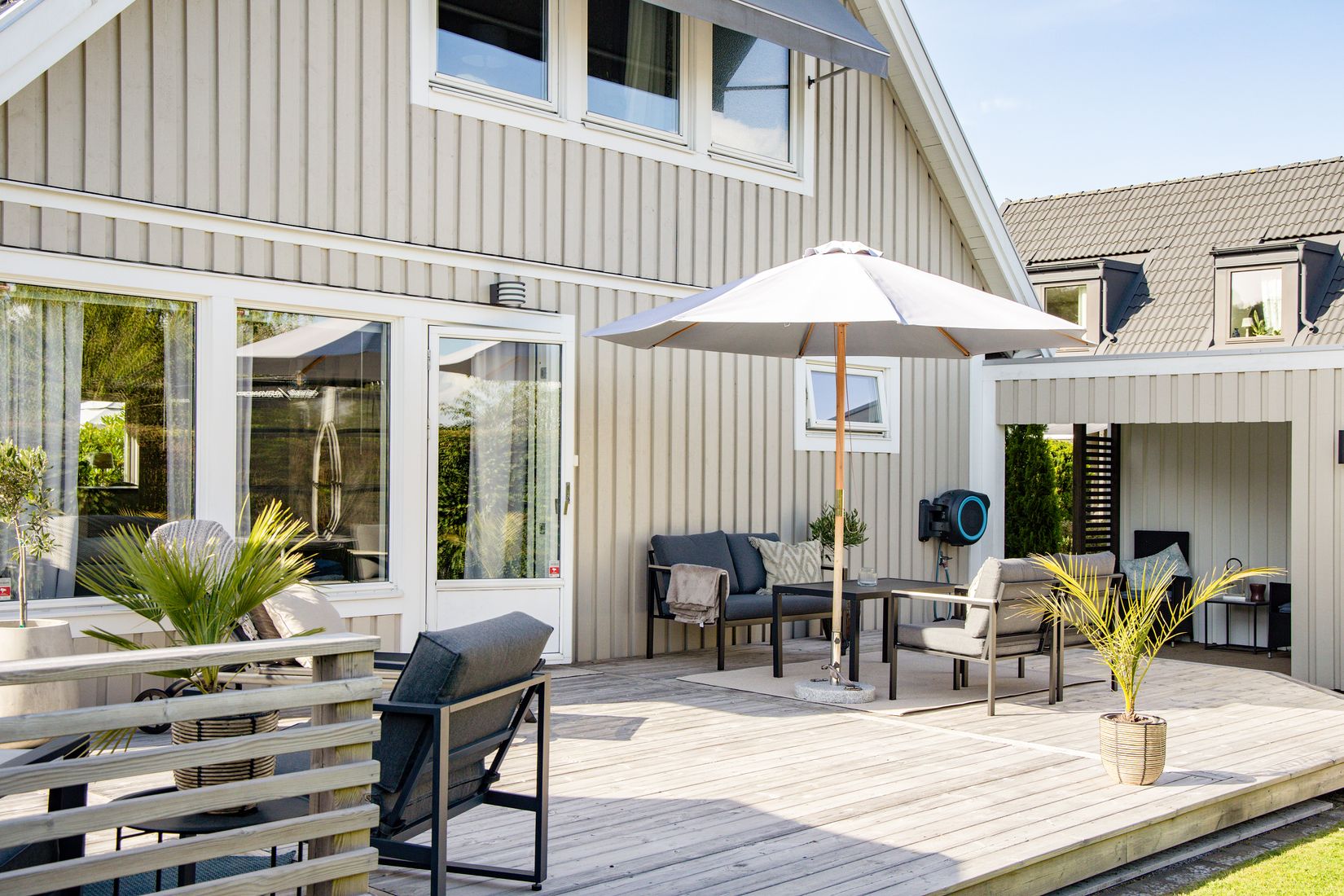 Utemiljön är en naturlig förlängning av huset. Den fina altanen tillsammans med gräsmattan skapar en privat och trivsam plats för lek, avkoppling och sociala tillställningar. Här finns utrymme för både grillkvällar, lek, odling och avkoppling – en plats att njuta av under årets varmare månader.