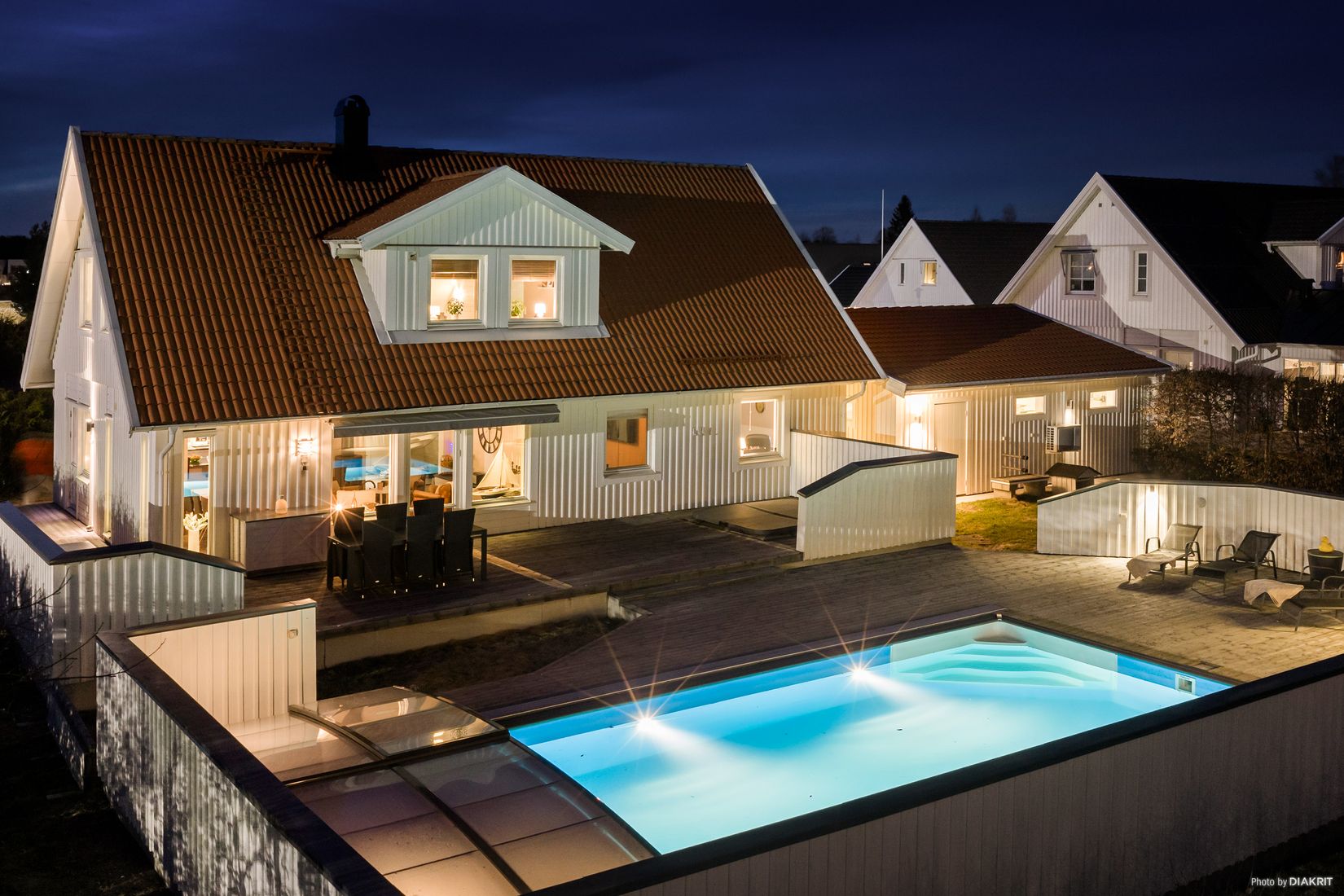 Utomhus väntar en härlig saltvattenpool och en rymlig altan i soligt söderläge – en perfekt plats för avkoppling, umgänge och långa sommardagar.
