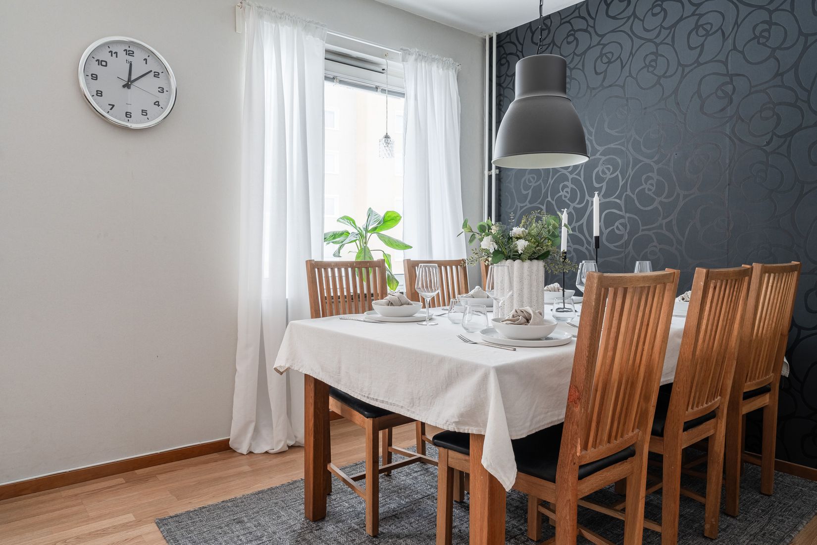 Lägenheten erbjuder ett trivsamt och funktionellt kök med gott om plats för ett större matbord, idealiskt för sociala tillställningar. Vidare in i bostaden möts ni av ett rymligt vardagsrum med generösa ytor för soffgrupp och tv-möblemang. Sovrummet är rofyllt med sobra, inbjudande färgval och fönster mot norr. Badrummet är smakfullt renoverat och utrustat med tvättmaskin för extra bekvämlighet.