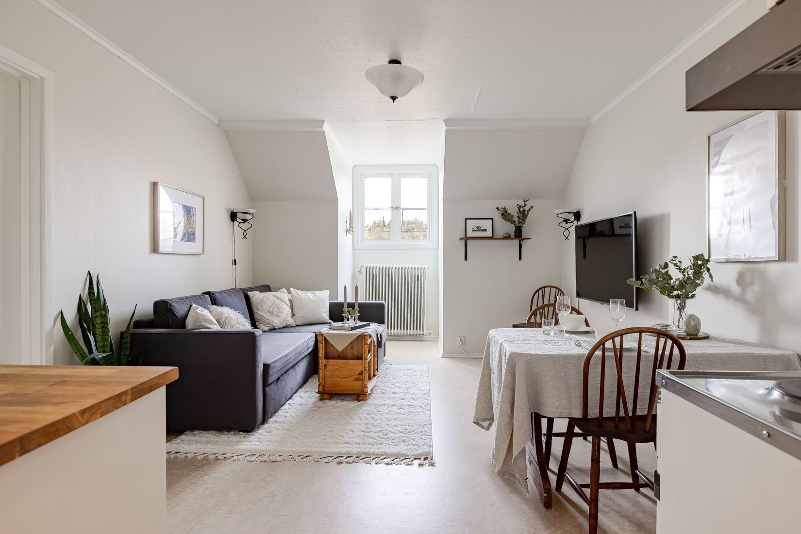 Lägenheten ligger på tredje våningen, längst upp i huset, vilket ger ett trivsamt och ostört läge. Innanför entrén möts du av en hall som leder vidare till bostadens rum. Här finns ett ljust vardagsrum med trinettkök, ett sovrum samt ett badrum. Till lägenheten hör ett stort förråd i källarplan samt tillgång till ett förråd i anslutning till bostaden – perfekt för exempelvis skidutrustning eller friluftsprylar. I föreningens källarplan finns även tvättstuga och torkrum. Ett boende som passar perfekt som fjälllägenhet, fritidsboende eller för dig som vill bo centralt med närhet till både service och natur.