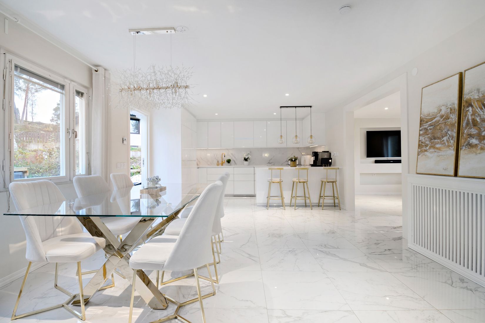 Villan erbjuder ett modernt och påkostat hem där ljus och eleganta materialval står i fokus. Här möts du av generösa sociala ytor med en öppen planlösning mellan kök och vardagsrum, stora fönsterpartier som släpper in rikligt med ljus samt en stilren inredning i ljusa toner med exklusiva detaljer i guld och marmor.