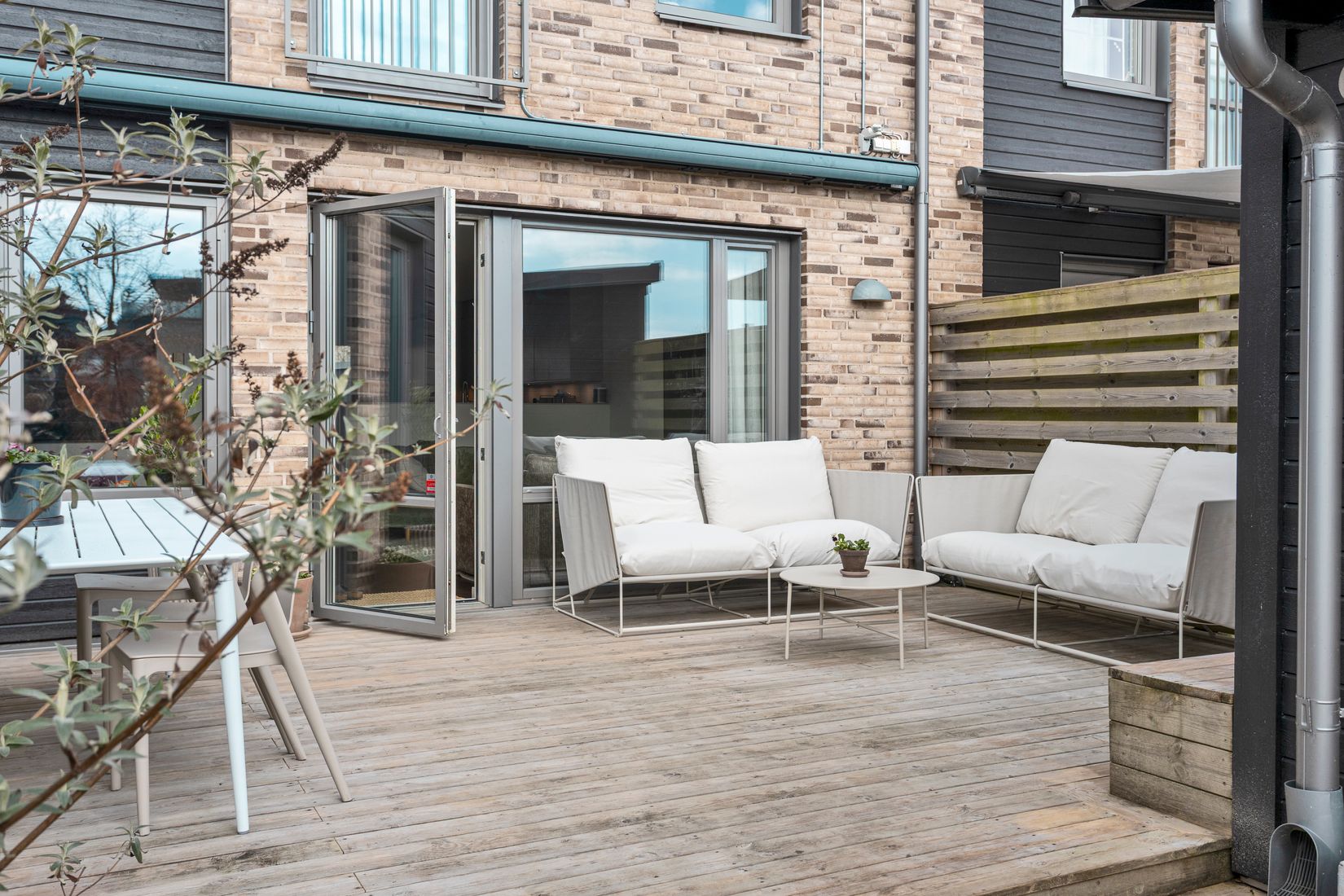 Utemiljön är inbjudande. En solig söderträdgård med ett läckert trädäck som bjuder in till avkoppling, middagar och långa sommarkvällar. Här kombineras privatliv med närhet till hav, natur och lek.
