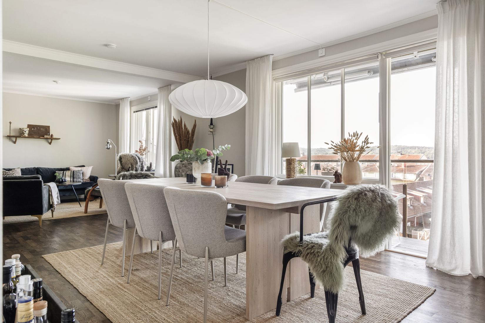 Interiören bjuder på en stilfull entré med klinkergolv som övergår i vacker parkett som löper genom hela bostaden. Vardagsrummet är stort och luftigt, med generösa fönsterpartier som släpper in rikligt med ljus och ger en härlig vy mot den charmiga balkongen.