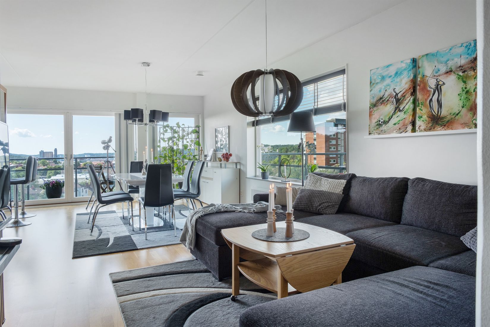 I vardagsrummet finns plats för både matgrupp och soffdel, och härifrån bjuds ni på en fantastisk utsikt oavsett var ni befinner er. Från rummet når ni även bostadens generösa balkong som sträcker sig runt fasaden, där ni kan följa solen från tidig morgon som sedan kommer tillbaka på eftermiddagen för att sedan njuta av solnedgången – helt perfekt läge!