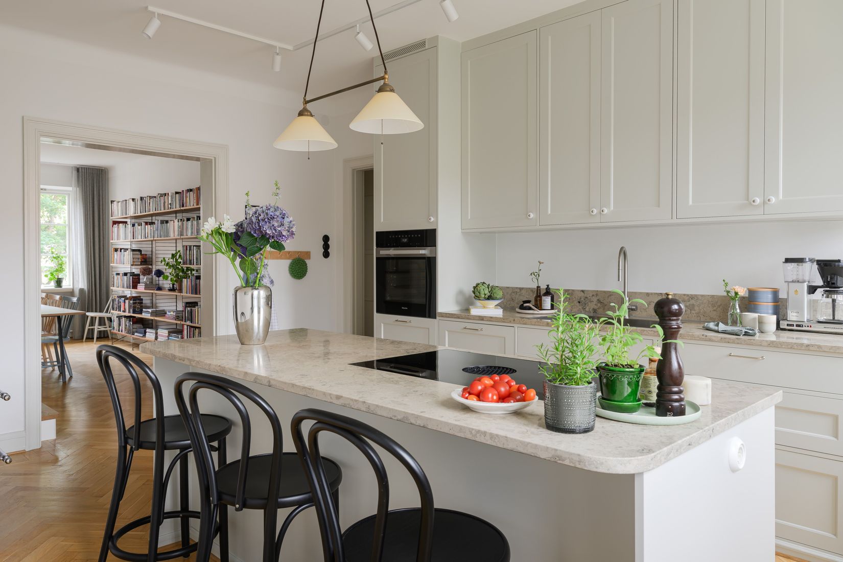 Redan vid första steget in slås du av ljuset, rymden och de klassiska kvaliteterna som sekelskiftesarkitekturen skänker: takhöjd, eleganta linjer och de stora fönsterpartierna med spröjsat glas som släpper in rikligt med dagsljus och ramar in rummen som levande tavlor. På nedre plan breder en tidlös fiskbensparkett i ek ut sig och bildar en scen för både vardagsliv och fest. Här finns generösa sociala ytor där middagar blir till upplevelser och vardagen får ett extra lager av skönhet.
