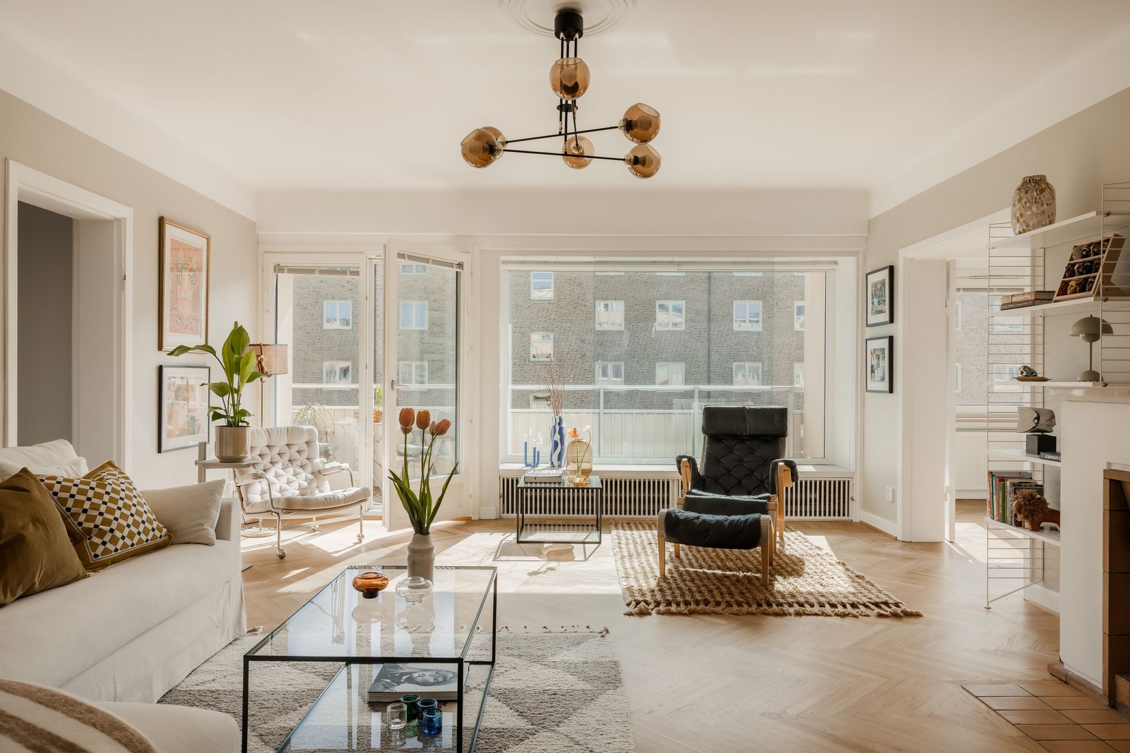 I hjärtat av Fridhem finner du Regementsgatan 33A och denna imponerande bostad, inhyst i en byggnad uppförd av byggmästaren Hugo Åberg under sent 30-tal. En resa genom tiden där kvalitet och stil möter modern bekvämlighet, detta i en bostad där varje kvadratmeter är genomtänkt till perfektion. Det historiska arvet som fiskbensparkett och fönsterbrädor i sten blandas harmoniskt med nutida funktionalitet, till exempel i det renoverade kökets förvaringsmöjligheter och arbetsytor. Det underbara ljuset som spelar över ytorna går aldrig ur tiden.
