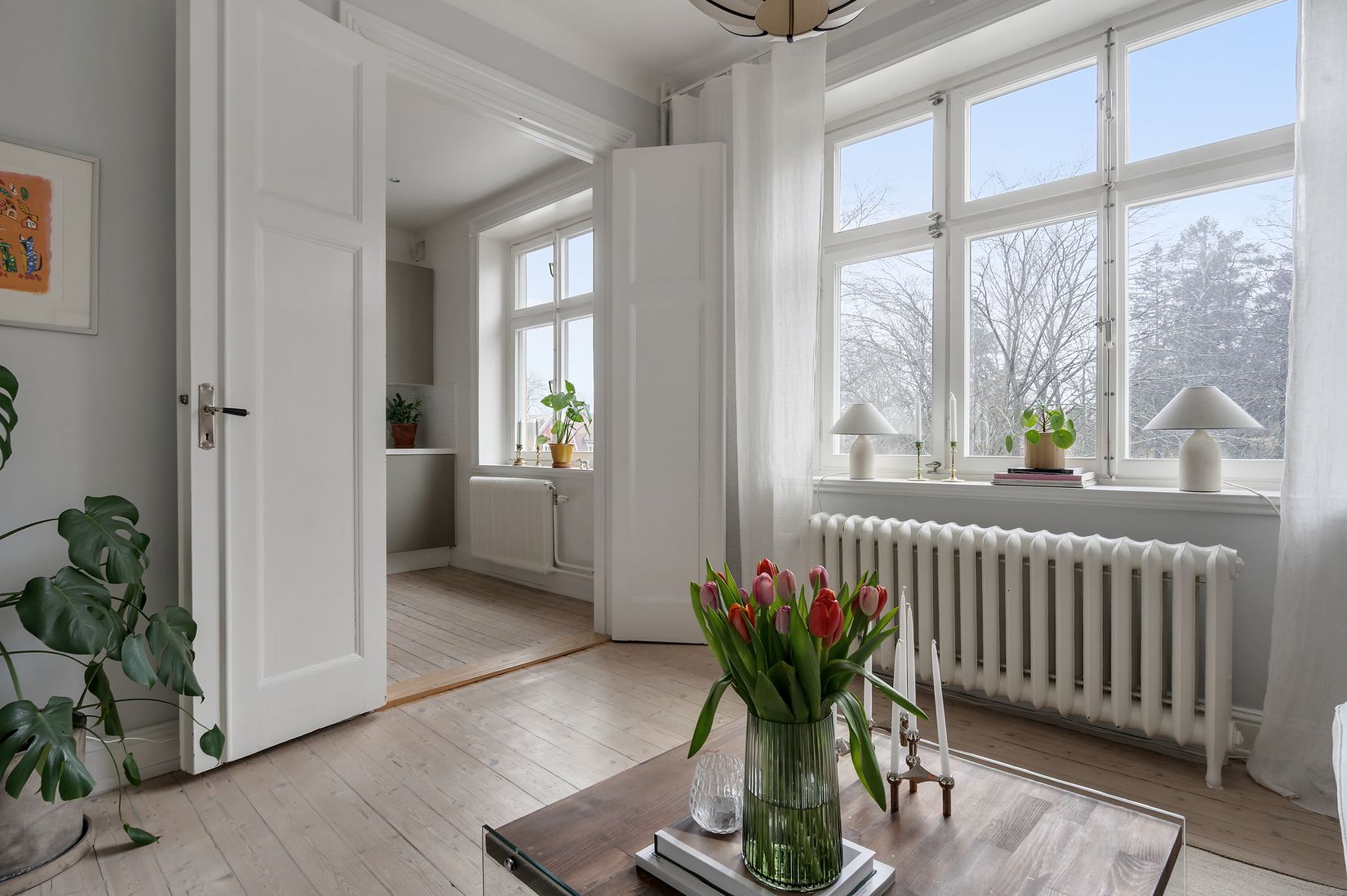 Bostaden präglas av fina ytskikt, vackra trägolv och ett generöst ljusinsläpp. Det rymliga allrummet erbjuder goda möbleringsmöjligheter samt en praktisk platsbyggd bokhylla som skapar en naturlig avskärmning för sovalkov.