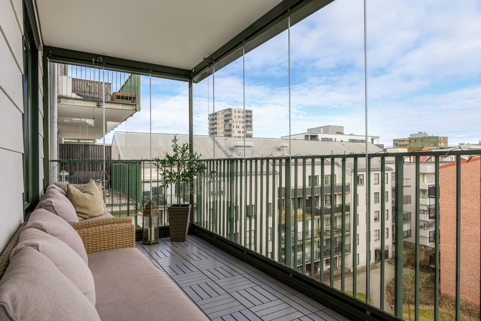 Innanför dörren möts du först av klinker och sedan av stilren vitlaserad parkett som är genomgående för hela bostaden. I hallen finns gott om avhängningsmöjligheter och mycket förvaring i flertalet garderober. Bostaden karaktäriseras av genomgående hög standard med fina tillval så som stenskiva och det vitlaserade parkettgolvet. Köket från Marbodal är både fullutrustat och stilrent med vita skåpssnickerier samt erbjuder gott om arbetsyta. Köket är praktiskt utformat på två motsatta sidor med maskiner i arbetshöjd och leder vidare till vardagsrummet som bidrar till en rymlig samt social planlösning. Vardagsrummet är rymligt med goda möjligheter att möblera med både stor matsalsgrupp och soffa utan att det känns trångt. Från vardagsrummet nås den första balkongen med eftermiddagssol. Vidare har bostaden två rymliga sovrum med förvaringslösningar och från det större sovrummet nås bostadens stora inglasade balkong. Här har du en inglasad oas som ligger i rofyllt läge med utsikt över takåsarna och föreningens gröna innergård. Badrummet är helkaklat samt modernt i ljus färgsättning och erbjuder egen tvättavdelning med arbetsyta och förvaring. Till bostaden finns ett förråd att nyttja.